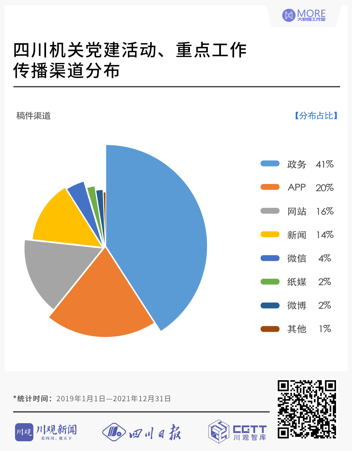 通过数据分析显示,2021年度全网范围内四川机关党建重点工作相关报道8541篇,其中在政务类APP和政务类网站上有关信息的传播量最大,占总量的41%,此类渠道为主要传播阵地;其次是新闻类APP,占比20%。