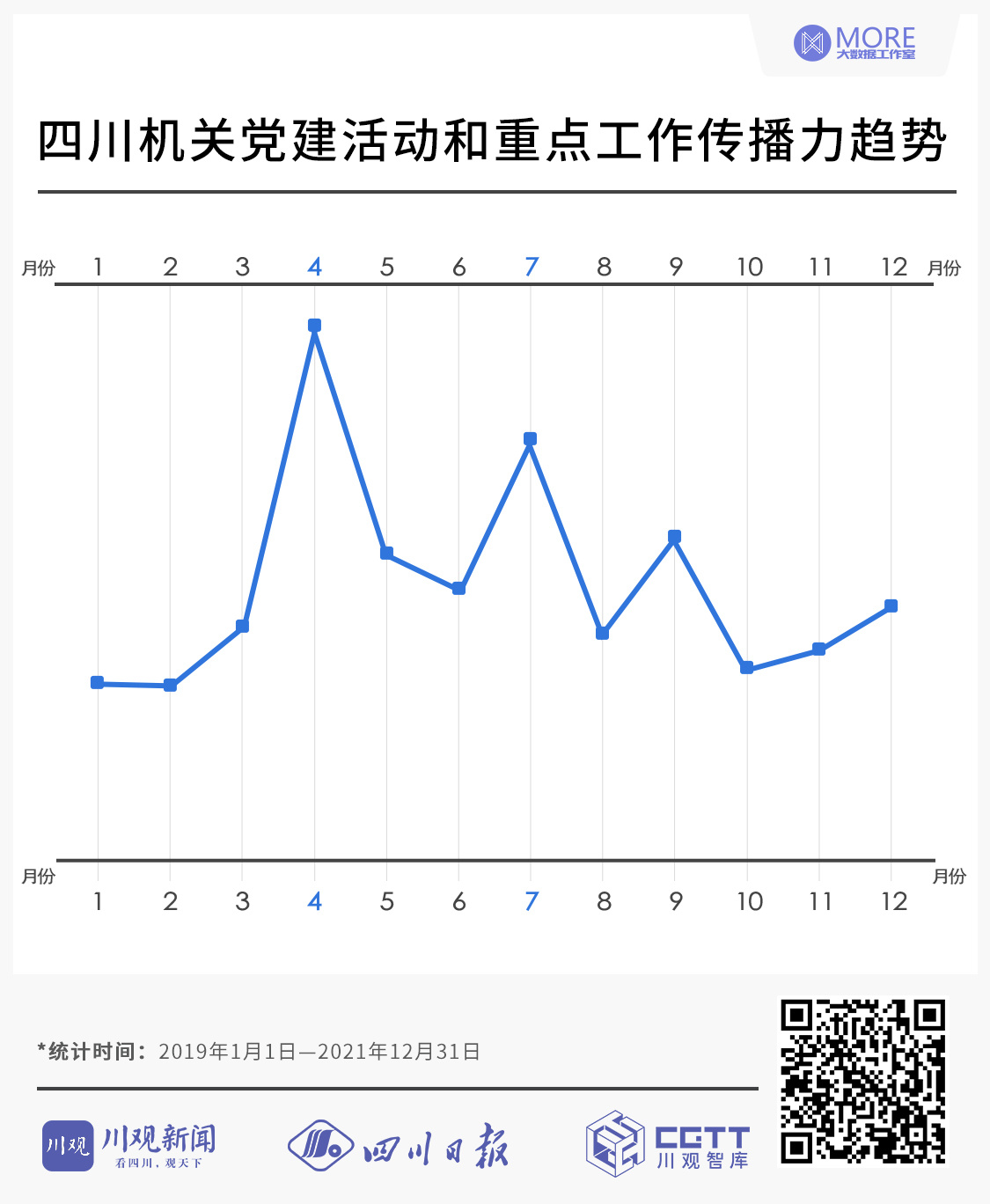 四川机关党建活动和重点工作的传播趋势,与各级各部门开展党建相关工作的安排部署有关。近三年数据显示,4月、7月、9月为四川机关党建工作传播力波峰阶段。