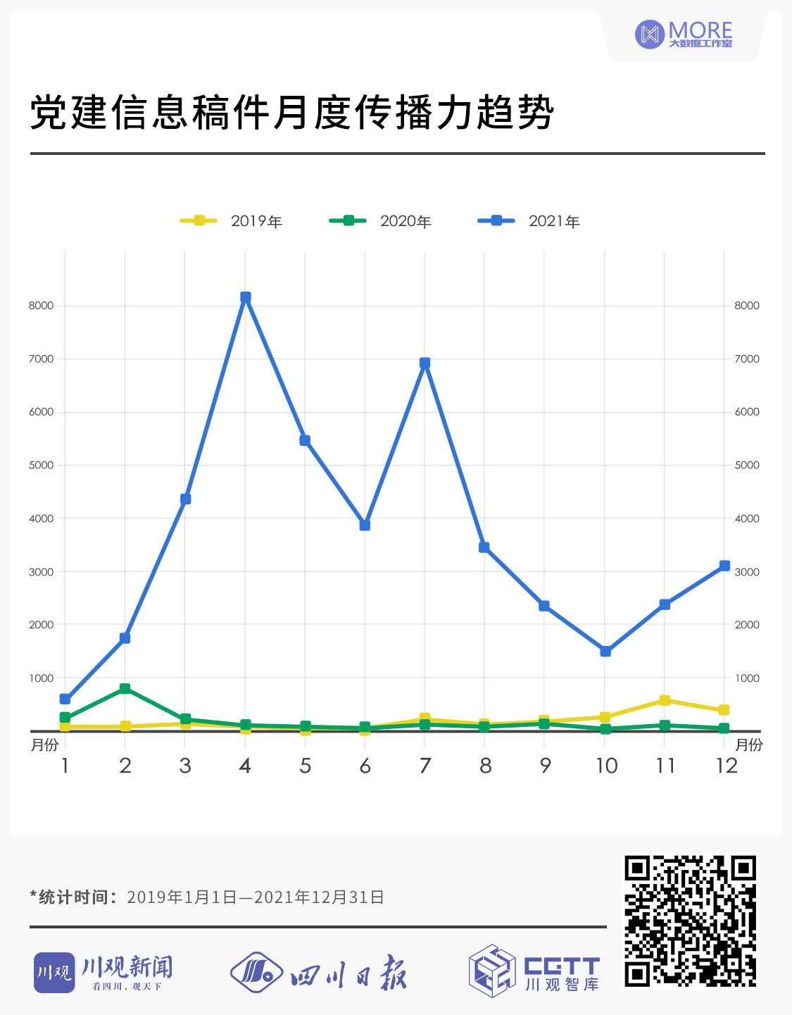 党建信息稿件方面,2021年省直机关工委党建相关稿件在全网的传播力明显高于2020年和2019年的传播力。