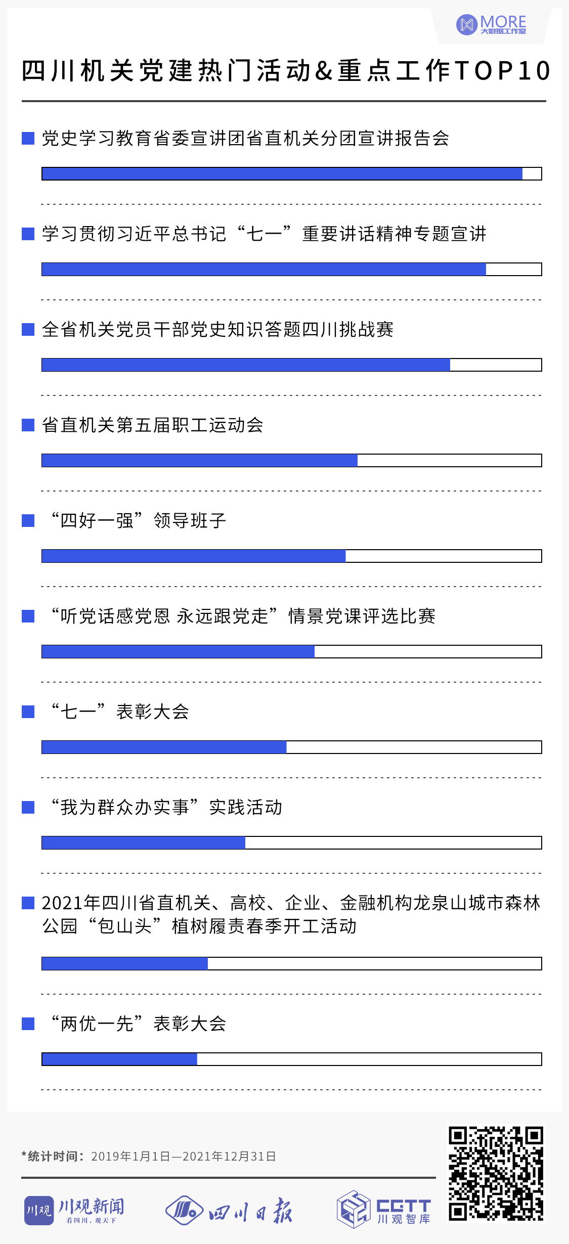 四川机关党建被报道次数最多的10项活动和重点工作如图所示,与党史学习教育、党史知识答题、第五届职工运动会、“四好一强”等内容相关的传播力大,仅“党史学习教育省委宣讲团省直机关分团报告会”一条的报道量就达到了3370次,相关活动均受到社会各界广泛好评,已成为四川机关党建和群团工作的响亮品牌。
