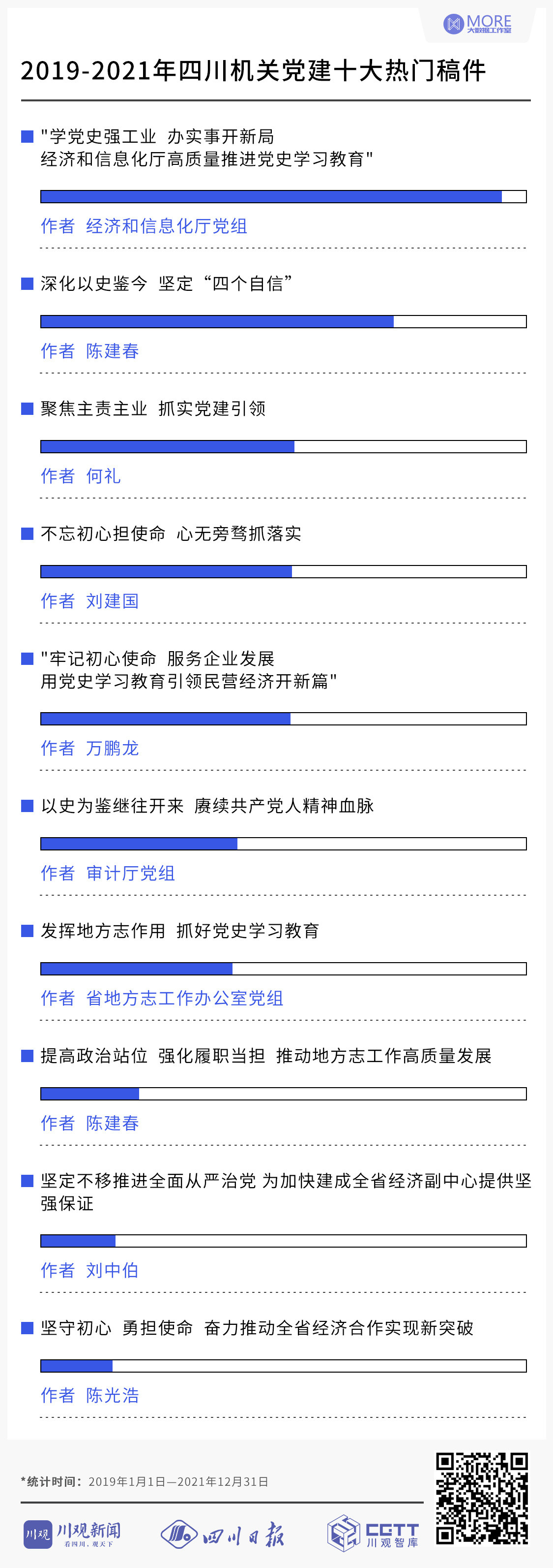 《四川机关党建》是中共四川省直属机关工作委员会主办的党建类杂志。近五年来,省直部门党组(党委)、市(州)党委理论学习中心组主要负责同志在《四川机关党建》期刊上发表署名文章247篇,机关基层党支部和个人学习心得体会135篇。通过对这些文章的全网传播情况数据分析,2019-2021年间,四川机关党建相关稿件被转载、引用6万余次。其中,传播量最高的10篇稿件均被转载、引用2000次以上,经济和信息化厅党组发布的《学党史强工业 办实事开新局 经济和信息化厅高质量推进党史学习教育》一文热度最高,达到了13295次。