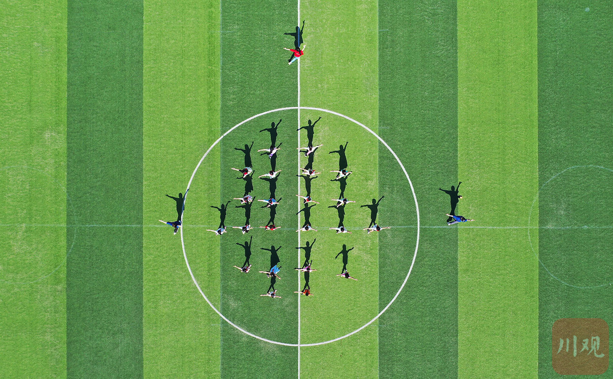 重庆大学艺术学院舞蹈表演专业的3名大学生志愿者,与华蓥市杜家坪小学的22名学生一起表演舞蹈《下山》(无人机照片)。