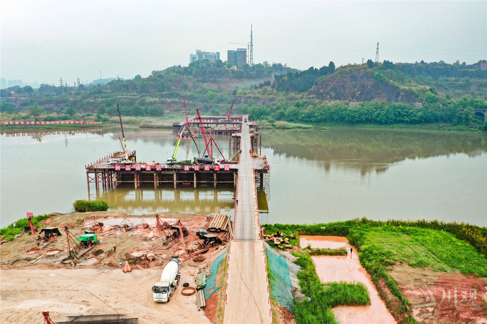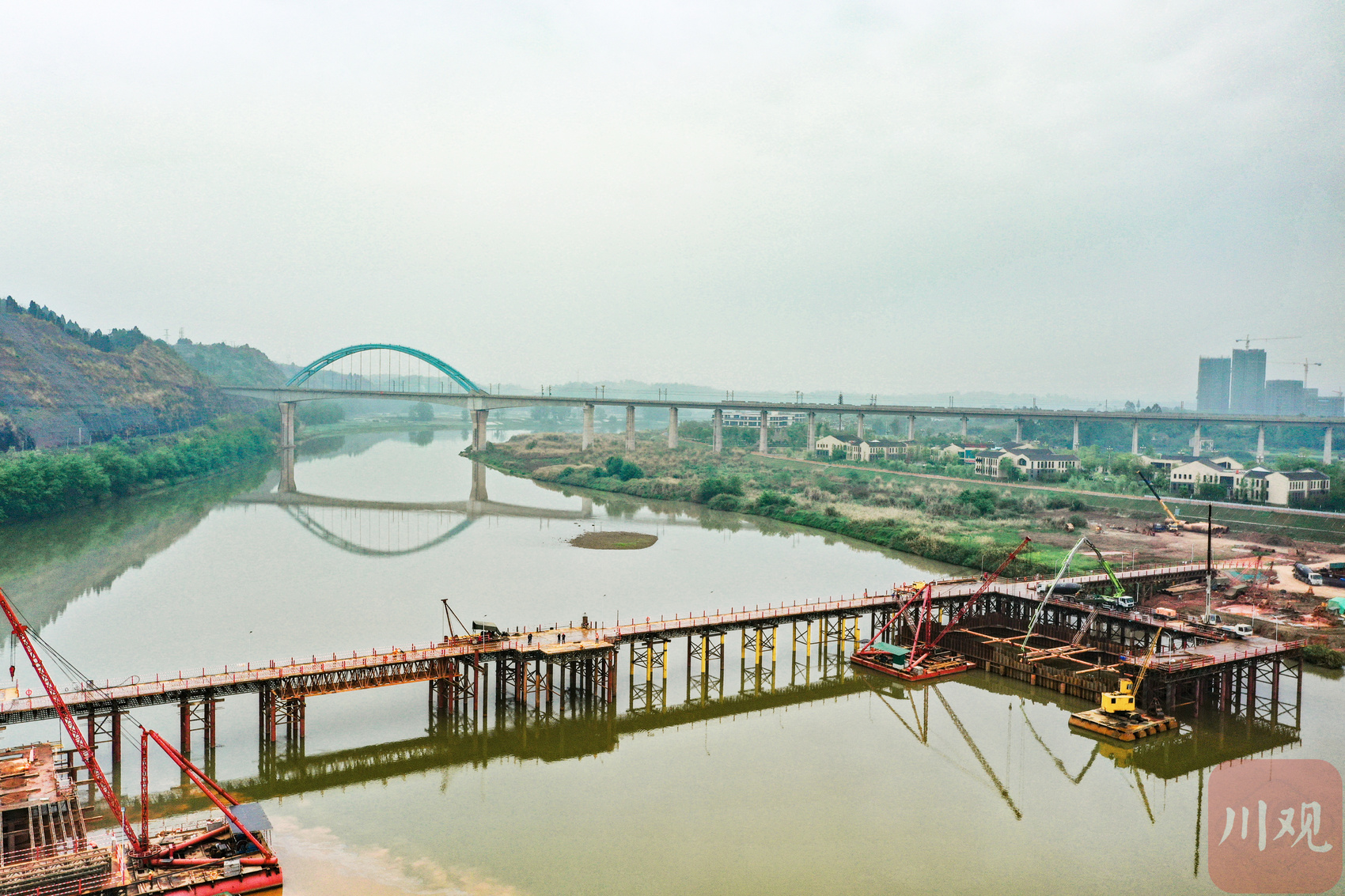 资阳沱东城区,汽车沿江而上,没多久,一座6米宽的临时钢栈桥横跨江面,江两岸均有多台大型机械隆隆作响,浇筑桥墩柱、土方开挖,现场建设一片火热。