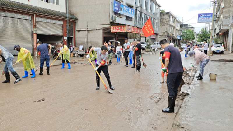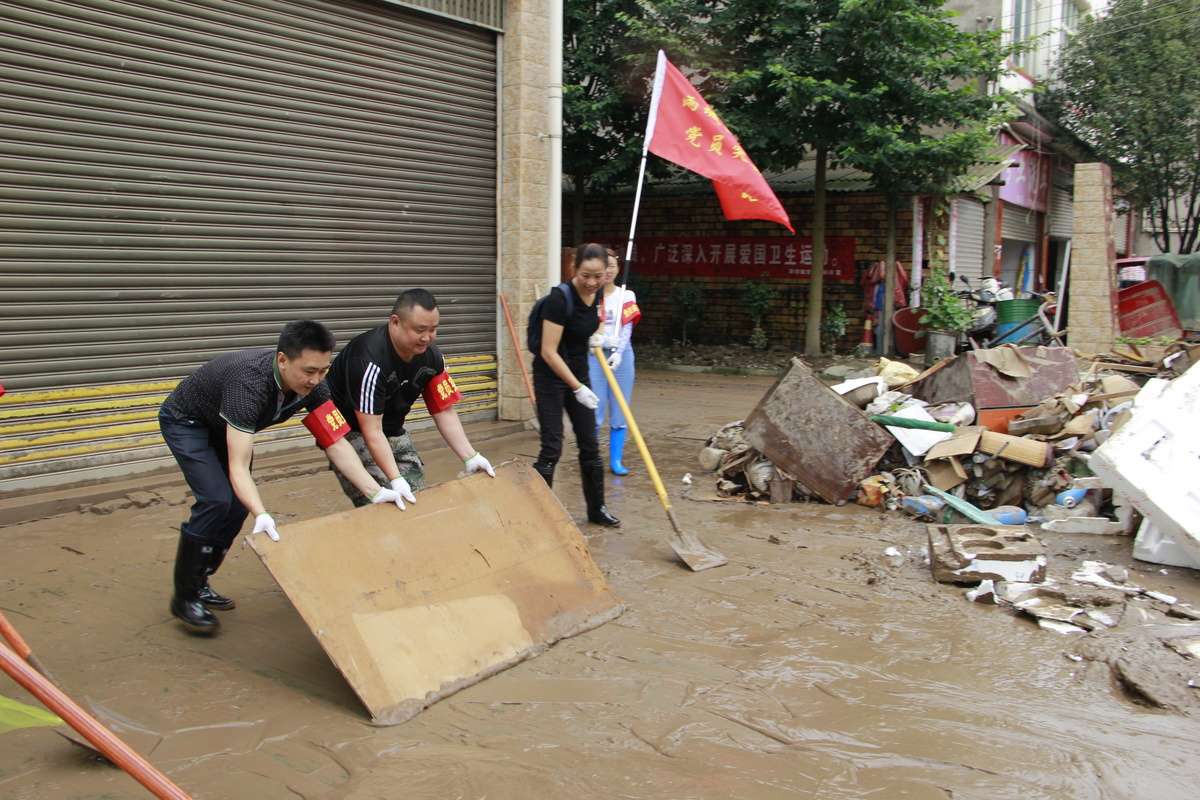 后来找到我们汇合的联络员引领我们继续往通江路进发。通江路的情况跟春江路差不多,要窄一些,约莫半个多小时都清完了,领导让大家原地休息一下。我一屁股坐在路边的砖块上,大口喘气,豆大的汗珠子不停的往下掉,衣服早就湿透了,全身都是泥点子。再看突击队的其他人,都差不多一个样,都说好久没干体力活太累了。气还没喘匀,对面两家商铺的老板过来找我们,一家要我们帮忙从地下室抬货架,一家要我们帮拆除一楼大厅里被水泡坏的隔间,于是男同志们兵分两路,二话没说就过去帮忙,主人家千恩万谢,大家虽然很累,但心里暖洋洋的。