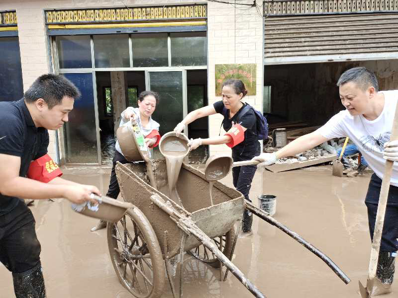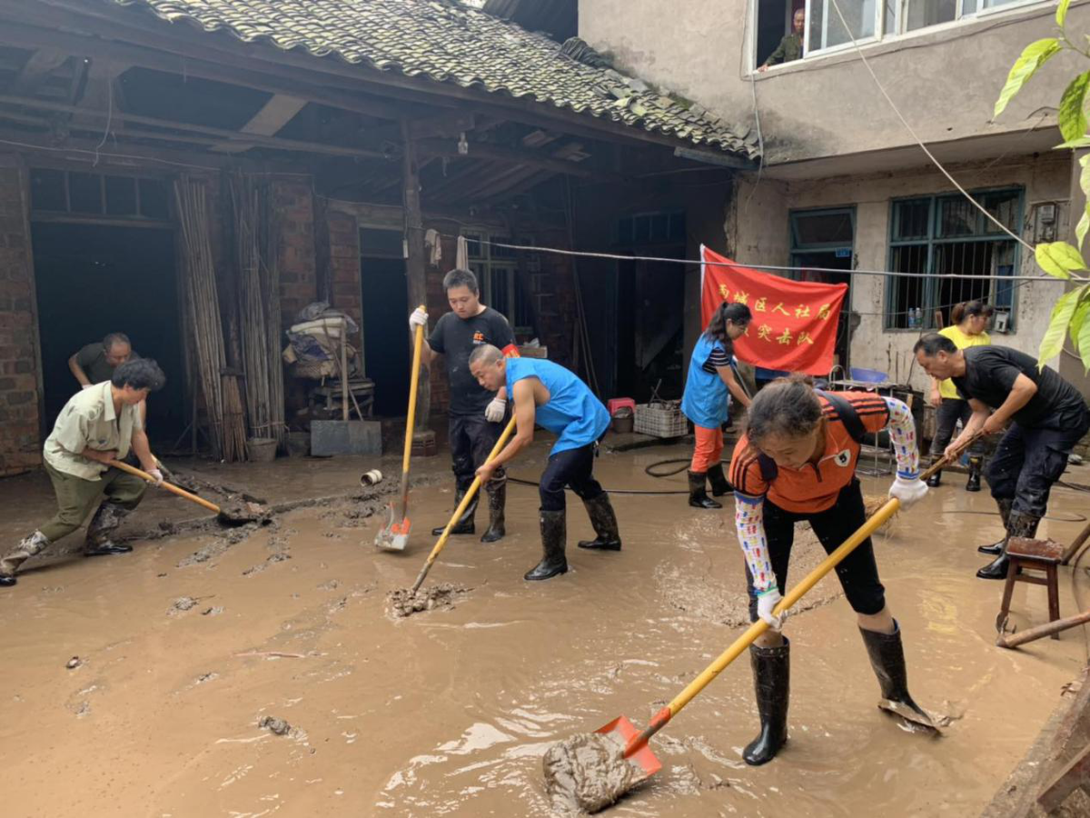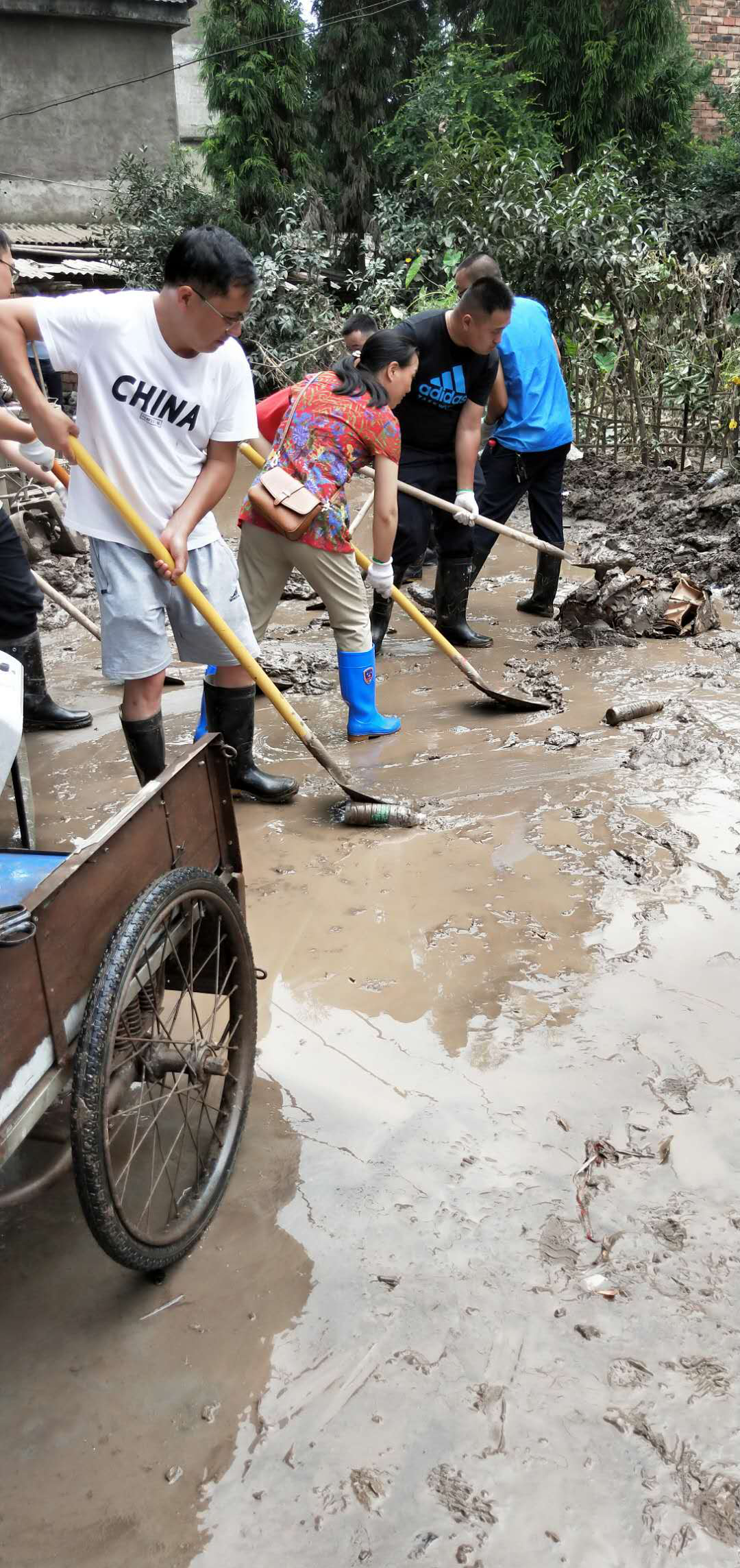 两个七八十岁的老人站立在卧室门外,手足无措,清理出来的一小片地方摆放着一个冰箱和一个冰柜,不是很宽的干坎上摆放着一辆小电动三轮车、一辆人力三轮车、两床晒垫,它们全都陷在厚厚的淤泥里。再往阴暗的屋里瞅,什么都有,电视柜、桌子、混乱不堪的床、斜倒在墙上的柜子、被水冲进屋里的树根、木材棍棒、倒塌的砖墙......伴随着飞舞的蚊虫和阵阵恶臭,直往脑门里窜。此情此景,我当时的第一个念头是“这样的房子还有抢救的必要吗,干脆放弃算了”。老人不停地念叨:“感谢你们哦,没得你们啊我们简直不晓得咋整喽!”让我没想到的是,平时十分注重装容仪态的促进中心毛婧主任毫不犹豫地踩进屋里,她察看了一圈,出来后说:只有先把杂物些清出来才好清淤泥。