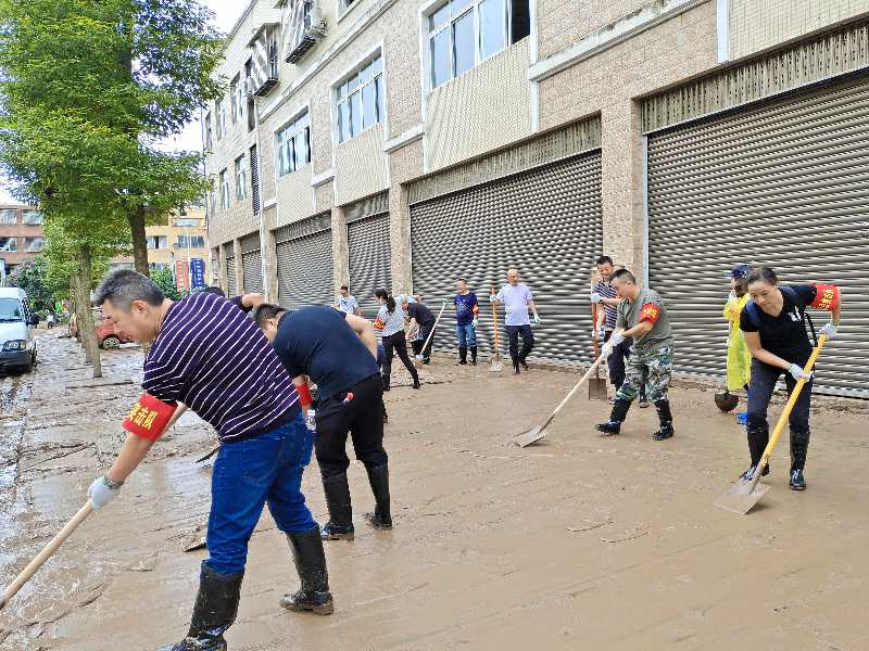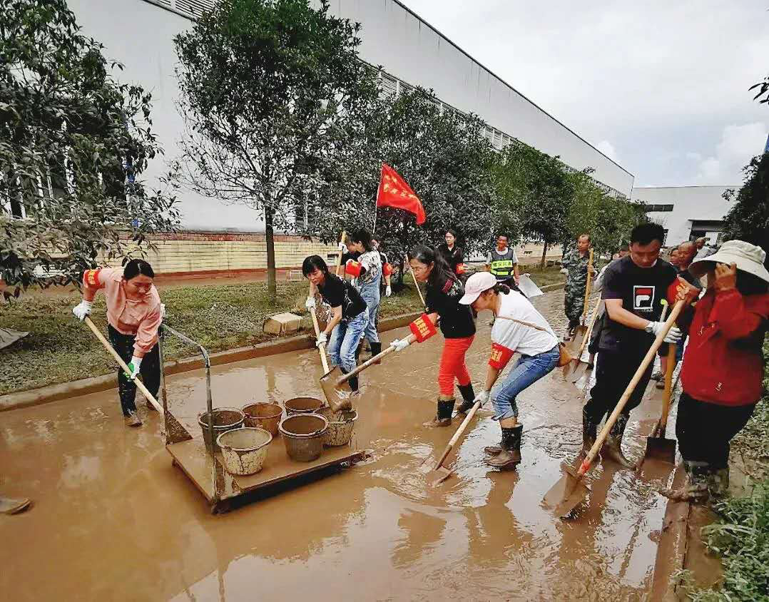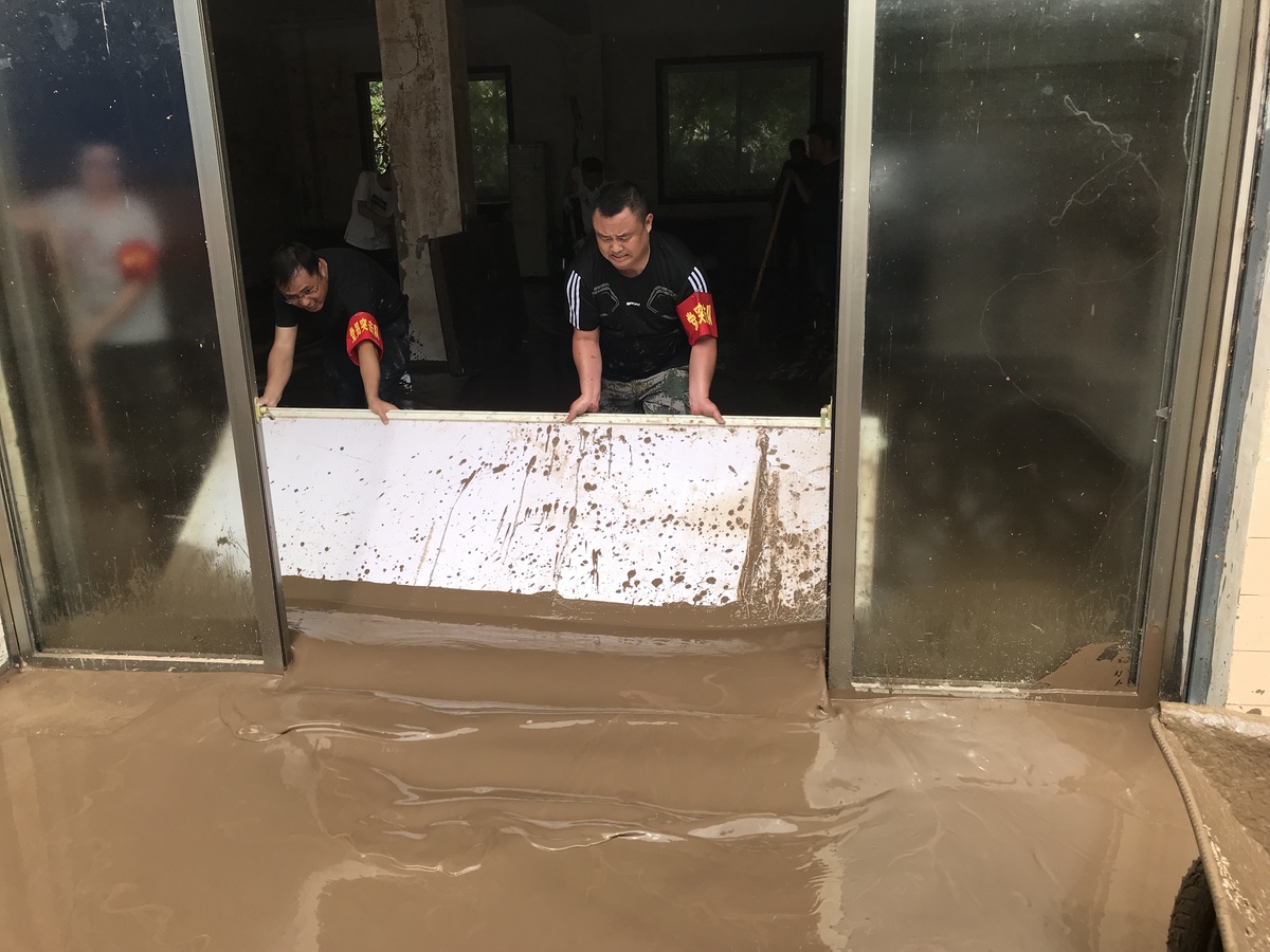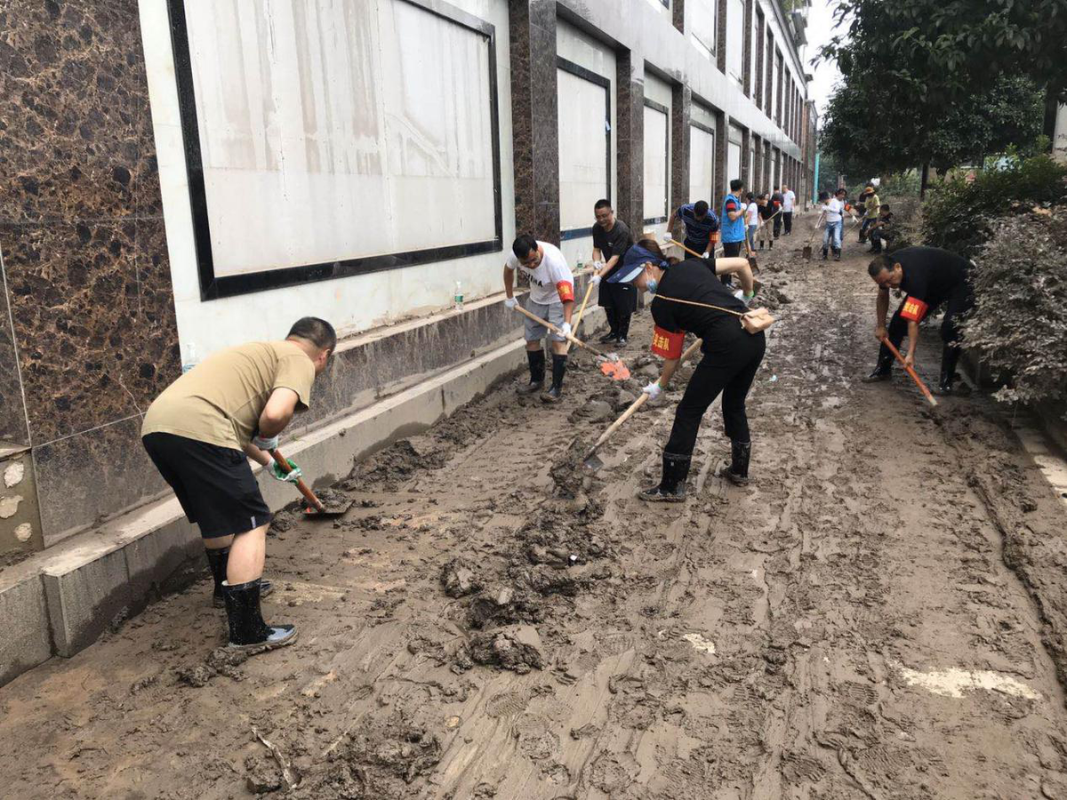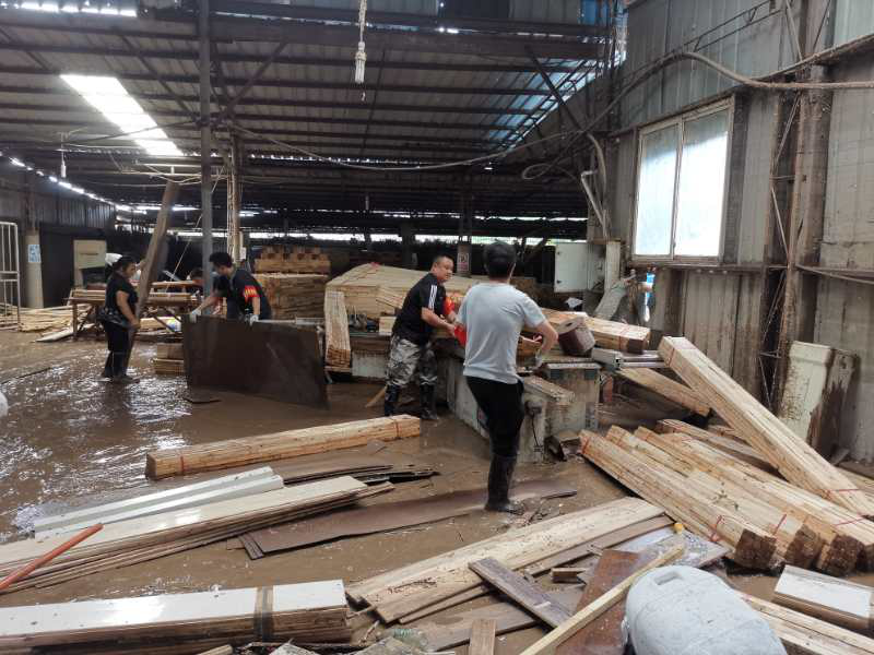 吃过午饭,局领导跟指挥部沟通后,决定马上去支援受灾的企业。在园区管委会同志的指引下,大家分成两组,第一组支援晶强板业,第二组支援金旗科技。我分在第一组,当我们进入晶强厂区,再次被眼前的情景震撼了,厂区道路上是足有7、8公分厚的稀泥,所有的厂房里都积了厚厚一层泥浆,成捆的木条子、横七竖八的木板子、半成品的木门浸泡在泥水中,心里顿时凉了半截。怎么帮啊?就在大家心里直打鼓的时候,带队的廖体锦副局长一句话稳住了神,“再难也得帮,我们不干就得企业自己干,既然来了就不要犹豫!”经过和厂方人员沟通,大家决定从一个靠河边的车间开始清理,先把地上的木条、木板抬到高的地方堆放起来,把地面清理出来,我们想了很多办法,用铁锹、木板把淤泥往外赶,然后往手推车上装,再推出厂去倒,3个手推车轮换着干,但由于车间离门口足有100多米远,这样效率太低。厂方想了一个办法,在临河的墙壁上砸出一个1米见方的大洞,手推车能够直接将泥水倒入河中。这样一来速度快多了,大家干劲也更足。最让我敬佩的是这个厂的老板和员工,他们没有怨天尤人,没有被这场灾难击倒,只想着如何尽快恢复生产。一个企业能够生存,我相信精神层面的韧性是必不可少的,只要具备这种力量,再大的困难也能够克服。