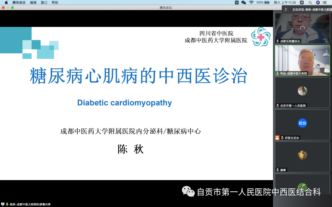 成都中医药大学附属医院大内科主任、内分泌科/糖尿病中心主任、四川省学术技术带头人、四川省名中医陈秋教授讲述“糖尿病心肌病变中西医结合诊治进展”,分别从中、西医两个方面分享糖尿病心肌病的病理病机及治疗措施。