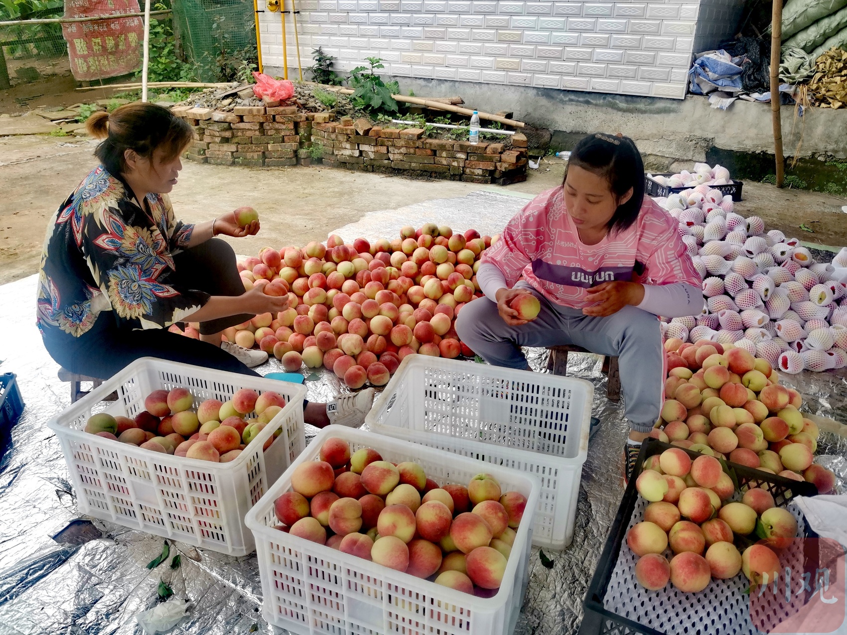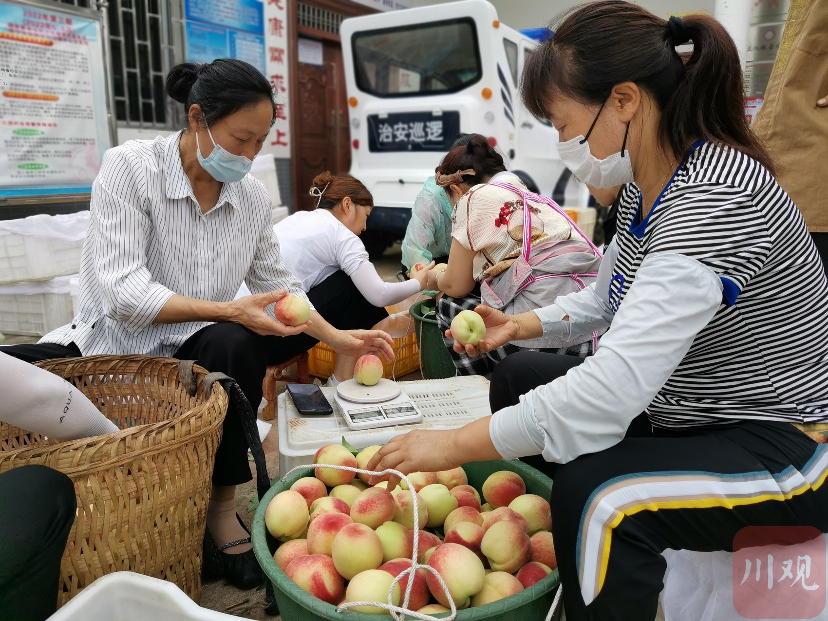 在广福村内,从成都来的收购商设置了十余处脆桃收购点。商家按照脆桃的大小、重量、颜色等进行分类,将脆桃细分为精品果、二优果、次果等品级,按价收购。