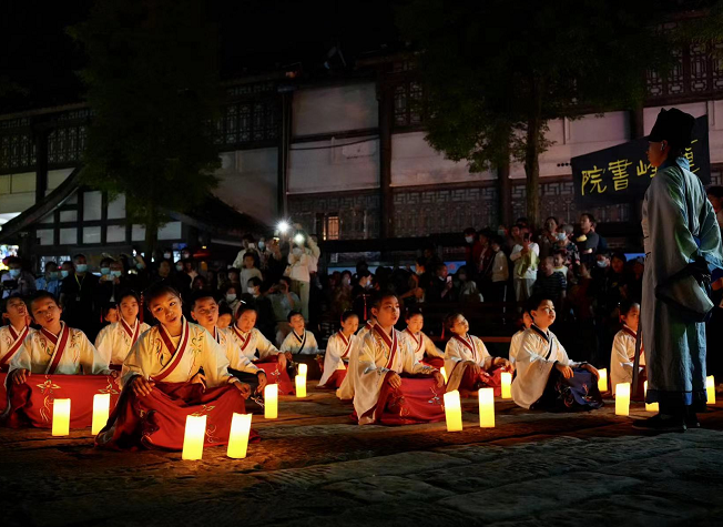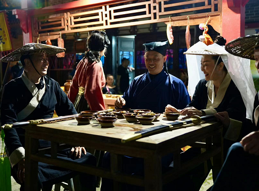 陶罐酒香,还原土陶制作,身临酒肆感受隆昌酒香;夏布青丝,还原夏布制作,并以优美舞蹈展现隆昌人质朴平和、素雅低调的性格气质。进入鬼市区,叫卖声,吆喝声,人头攒动。鬼市这一民风民俗最早起源于隆昌云顶古寨,“夜半相聚,鸡鸣则散”。在莲峰书院,书声琅琅,一群书童在老师的带领下背诵古文,呈现隆昌文脉的传承与延续。