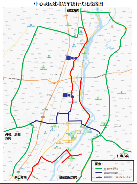 (四)将原仁寿方向至成都方向过境货运、工程车辆绕城通行线路调整为:仁寿方向-G351线一岷东大道一剑南大道南延线一彭山岷江二桥-G245线一彭山、成都方向。(双向通行)其他过境货运、工程车辆绕城通行线路不变。