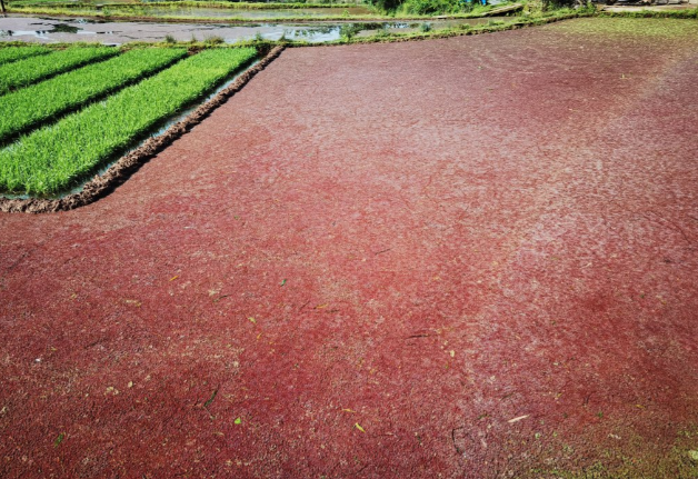 5 年来,南充市农科院土肥所在稻田里开展“稻—萍”模式研究,记者在基地看到9块稻田投放了红萍,还有1块稻田未有投放红萍,进行对比试验。据研究人员介绍,投放了红萍的稻田可减少20%化肥使用量。