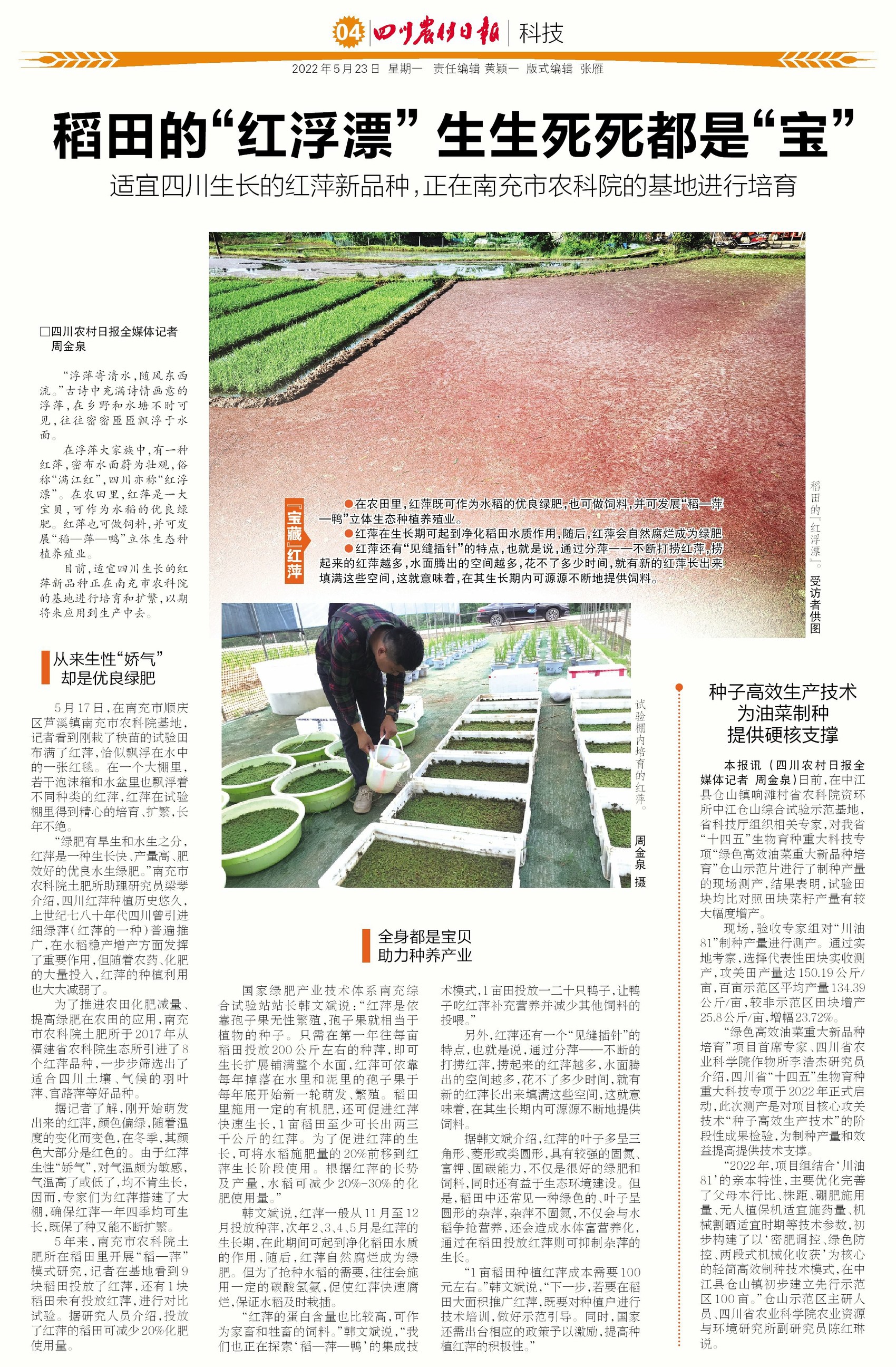 目前,适宜四川生长的红萍新品种正在南充市农科院的基地进行培育和扩繁,以期将来应用到生产中去。