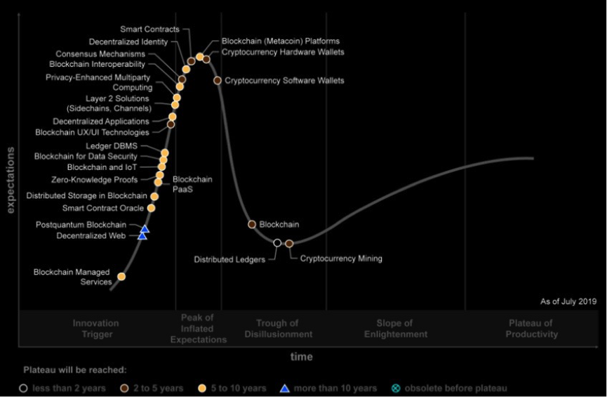 Gartner的2019 年区块链技术成熟度曲线图显示:区块链正在掉入“幻灭期”。随着技术发展以及由区块链独特支持的实践用例不断落地,到2021年市场将开始从低谷爬升。这个低谷幻灭期强调了由于实验研究和实施落地未能交付而导致大家对区块链技术市场兴趣度降低。