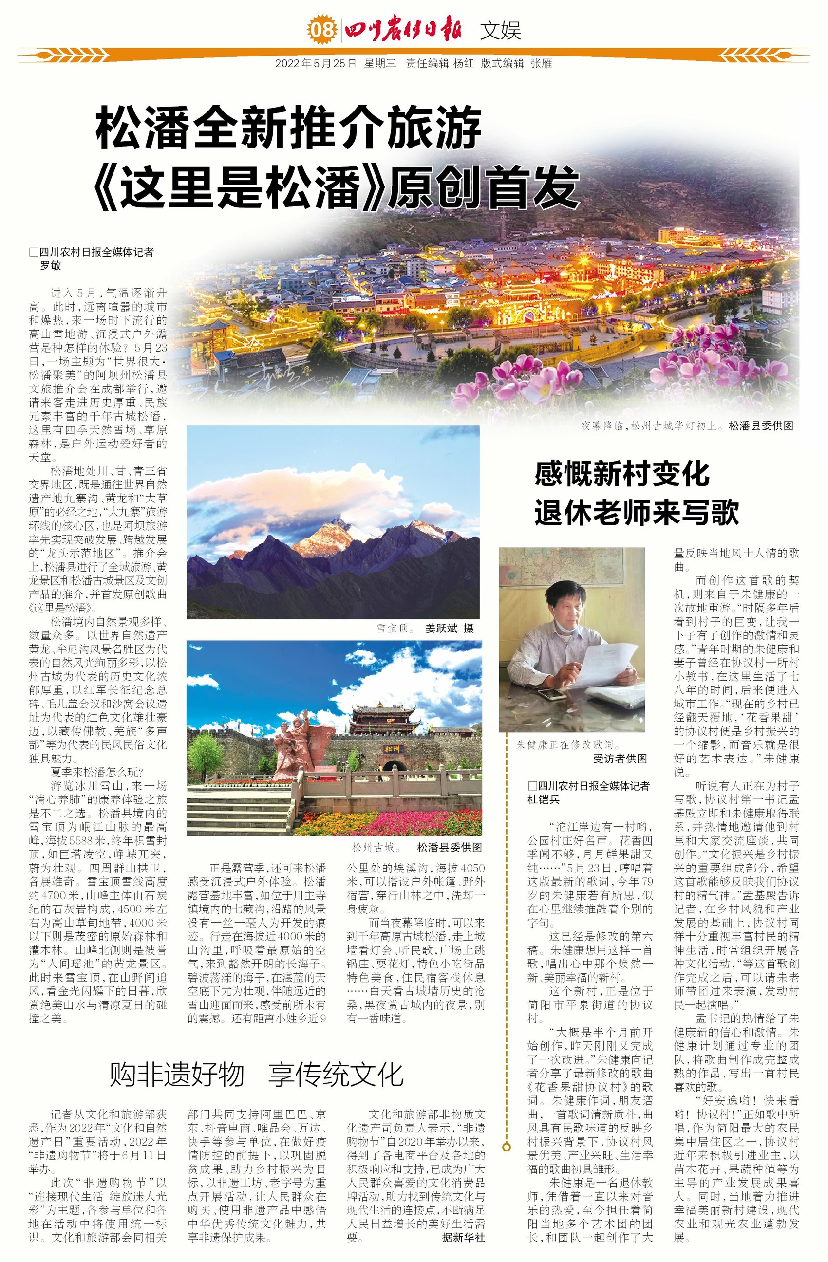 松潘地处川、甘、青三省交界地区,既是通往世界自然遗产地九寨沟、黄龙和“大草原”的必经之地,“大九寨”旅游环线的核心区,也是阿坝旅游率先实现突破发展、跨越发展的“龙头示范地区”。推介会上,松潘县进行了全域旅游、黄龙景区和松潘古城景区及文创产品的推介,并首发原创歌曲《这里是松潘》。