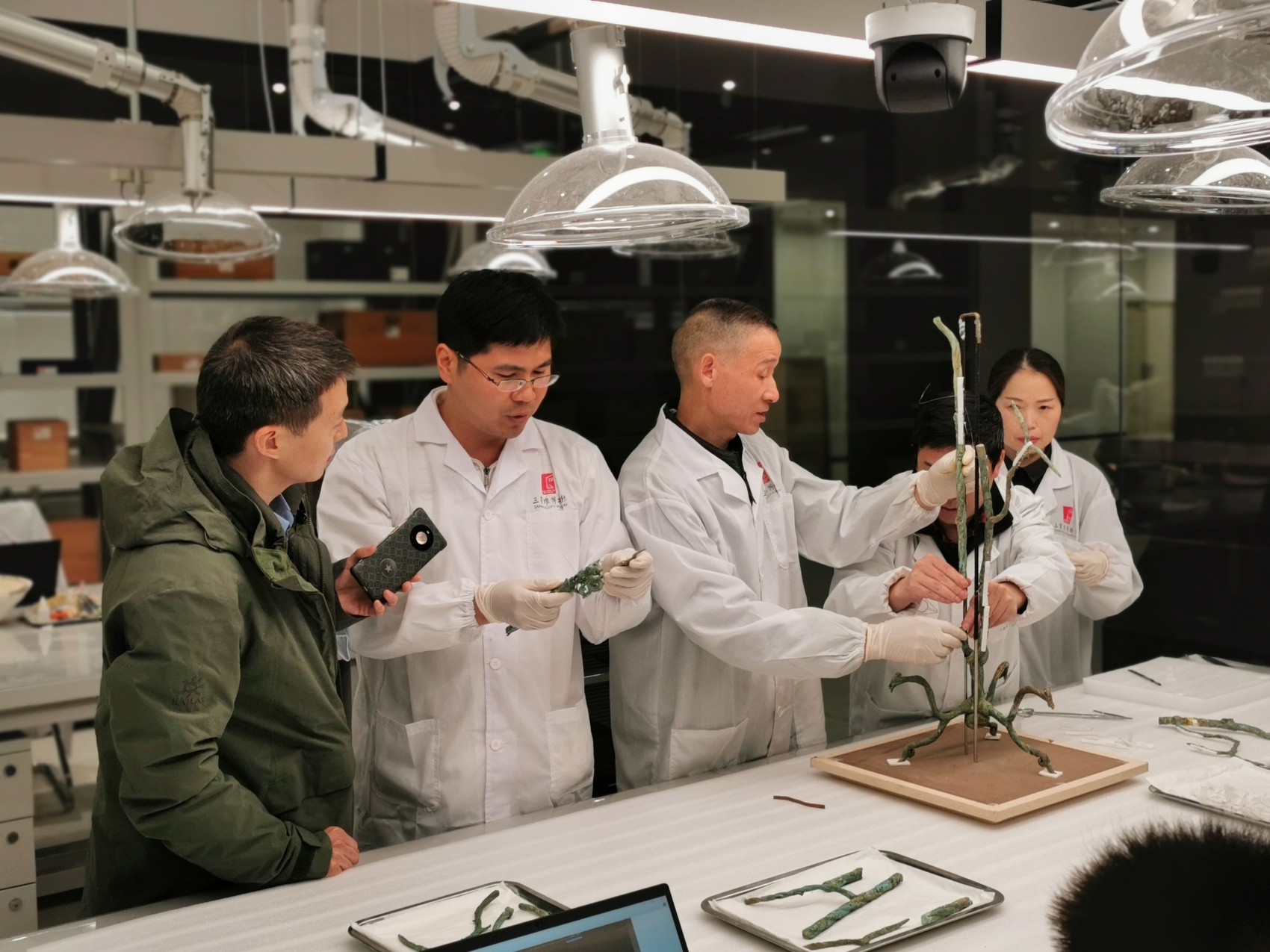 因此,近年来,除了文物保护与修复,余健越来越多地参与到跟文物相关的各个专业领域,包括陈列展览、藏品管理等。2019年10月至2020年1月,三星堆博物馆实施综合馆基本陈列提升改造工程,为了保证当年春节前重新开放,余健带领工作人员连续5天奋战到凌晨,每天除了吃饭几乎一直站着,晚上也睡在办公室。