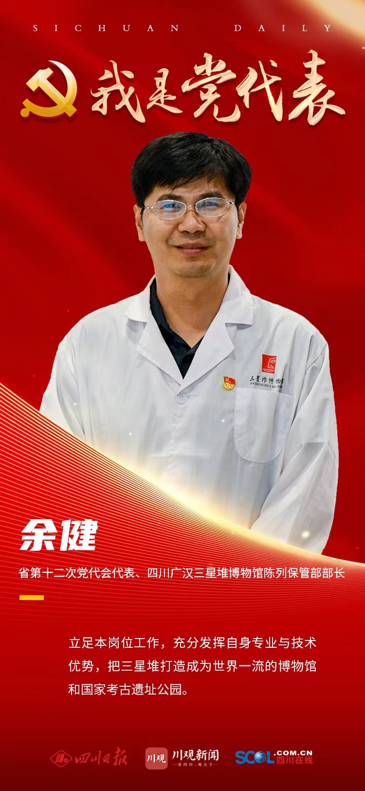 作为一名从事文物保护与修复工作的基层党代表,要立足本岗位工作,充分发挥自身专业与技术优势,稳步推进古蜀文明保护传承工程,把三星堆博物馆打造成为世界一流的博物馆,高标准推进建设三星堆国家考古遗址公园。