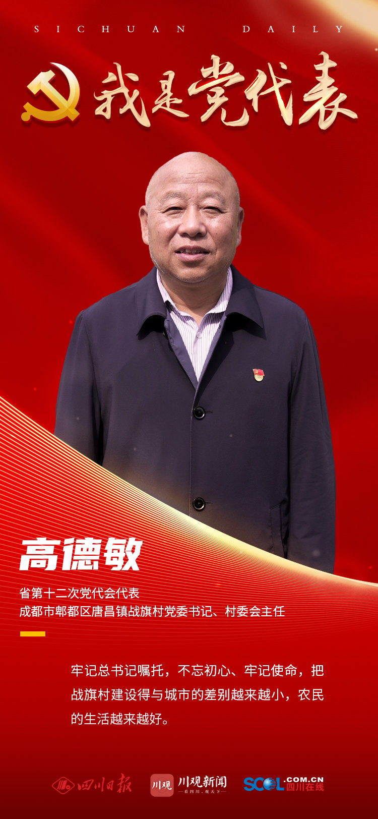 高德敏,成都市郫都区唐昌镇战旗村党委书记、村委会主任,党龄26年。2014年,被四川省委评为“农村优秀党组织书记”;2018年,获成都市“五一劳动奖章”、“成都市优秀共产党员”等称号;2019年,被四川省委评为“优秀共产党员”;2020年,被中共中央、国务院评为“全国劳动模范”。