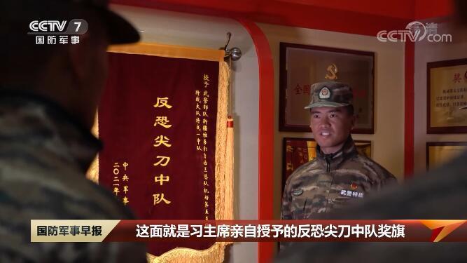 记者 李波:走进特战一中队的荣誉室,最引人注目的不是身旁这些标定着荣誉的奖杯和奖牌,而是我身后这展厅里的几个特殊陈列柜。在这些陈列柜里,陈列着官兵们在一次次反恐斗争中缴获的土制炸弹和管制刀具,它们见证了官兵的勇敢无畏和英勇牺牲。