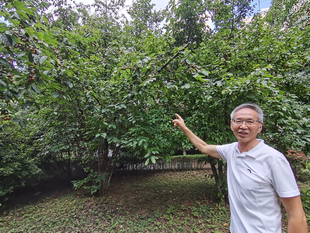 罗利群和他的肉果秤锤树。(记者 王代强 摄)