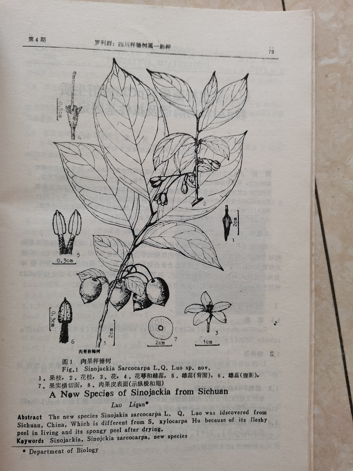 罗利群当年发表的论文中的肉果秤锤树插图。(记者 王代强 摄)
