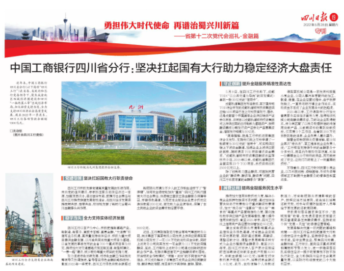 发展是解决我国一切问题的基础和关键——四川工行坚决扛起国有大行助力稳定经济大盘责任,坚持稳字当头、稳中求进,坚守主责主业,聚焦四川所需、金融所能、工行所长,面向经济重点领域和薄弱环节聚力发力,进一步确保落实扎实稳住经济一揽子政策措施不折不扣执行到位,全力助推四川经济社会高质量发展,以实际行动迎接党的二十大胜利召开。