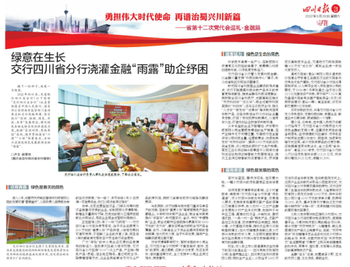 2022年初以来,交通银行四川省分行(以下简称“交行四川省分行”)认真贯彻落实中国人民银行、国家外汇管理局等监管部门各项要求和总行战略部署,坚定践行“创新、协调、绿色、开放、共享”发展理念,强化绿色金融支持实体经济建设力度,把握“区别对待、有扶有控”原则,稳步贯彻落实“六稳”“六保”部署要求,为四川省推进绿色发展提供金融“雨露”。
