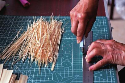 麦秆在熏、蒸、漂、刮等工序后,修齐整备用。