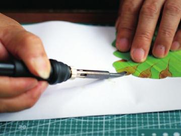 二楼是柏波的工作室,桌上摆放着制作麦秆画使用的工具:熨斗、刀片、电烙铁、胶水……工具简单,但要制作成一幅精致的麦秆画,过程却不简单。首先就是选麦秆,需用大麦秆尖上的第一节,自然晾晒后选取其中纹理色泽尚好的麦秆。此后,还要经过熏、蒸、漂、刮、刻、剪、烫、绘等近三十道工序。