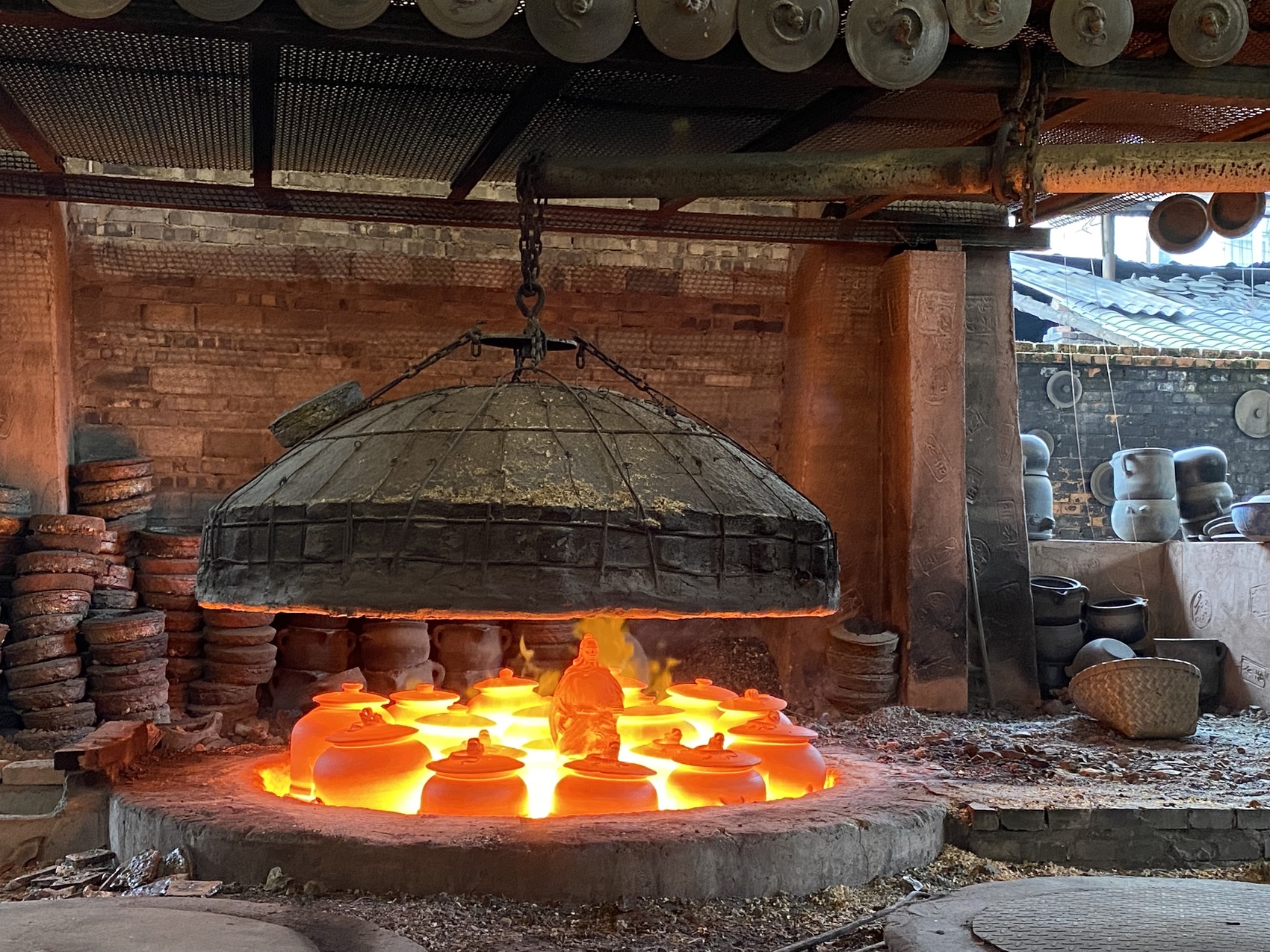 其中的重头戏,就是参观开窑。打开窑盖,热浪袭人,放入窑炉中的陶坯正在熊熊炉火中淬炼,通体红透明亮,尽显“土与火的艺术”魅力。“第一次来看开窑的人,几乎没有不举着手机拍照的。”曾庆红有些骄傲地告诉记者。