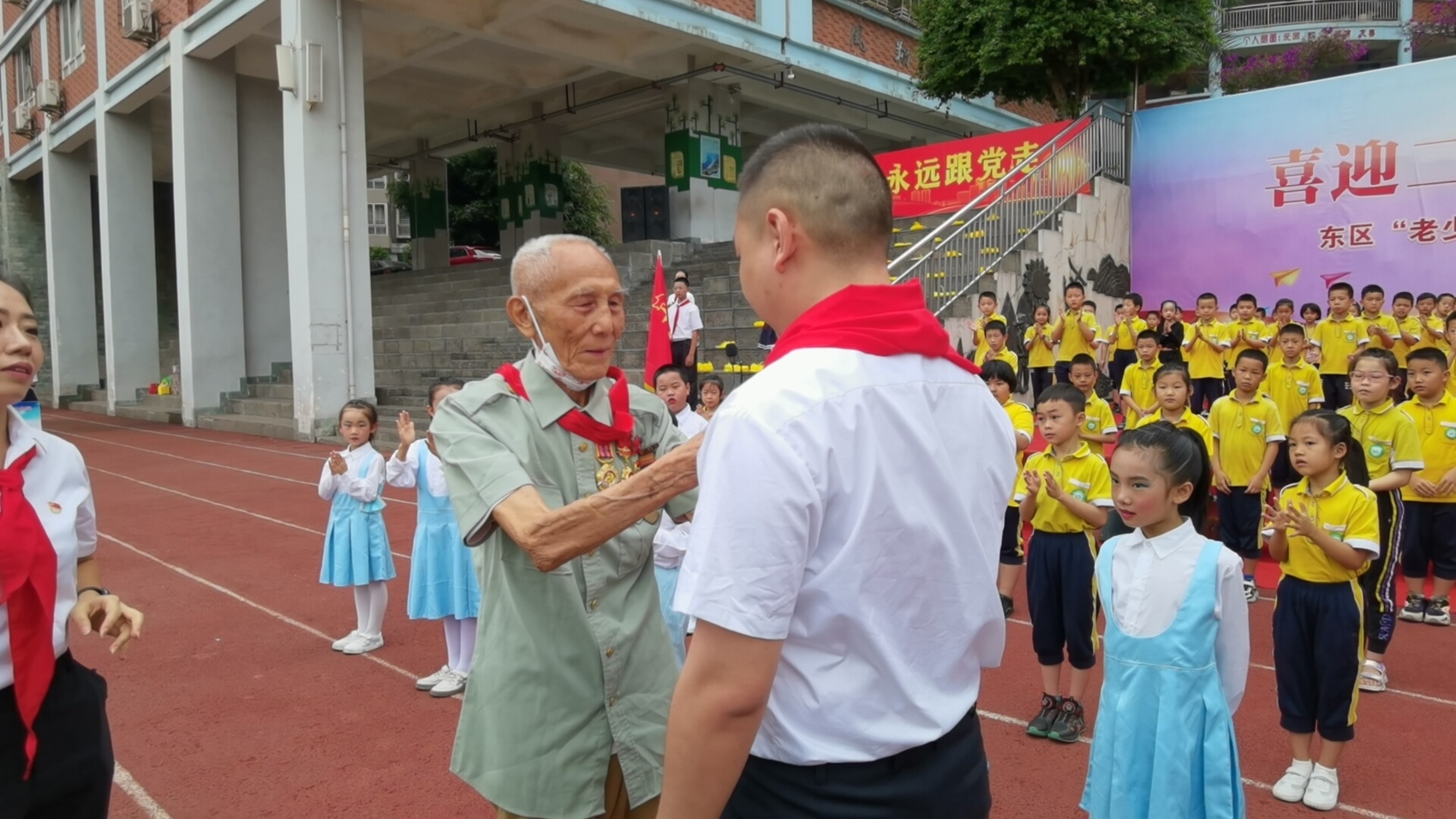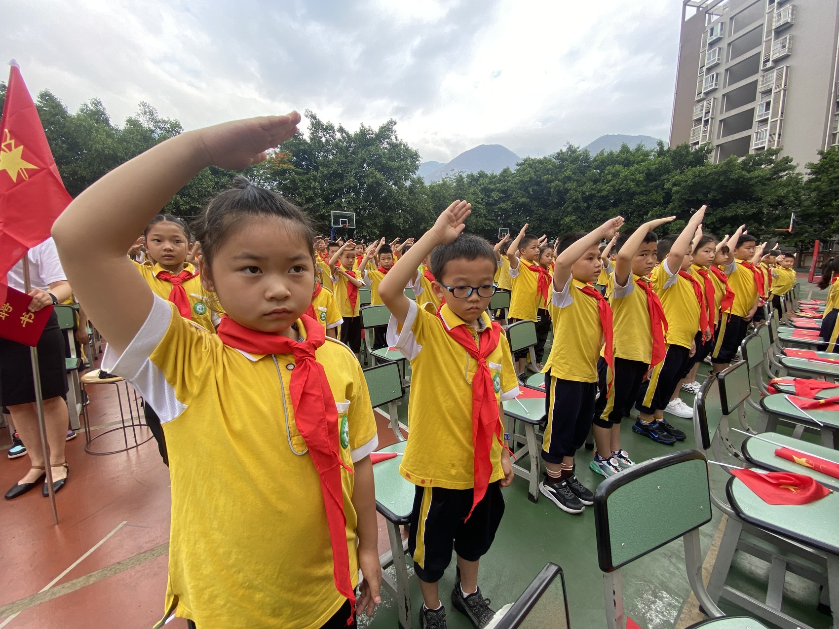 当天,在师生的注目下,攀枝花市凤凰小学校2022年首批少先队新队员在主席台站立,89岁高龄的老党员曾广贤步入主席台,给学校团员教师杨镇语佩戴红领巾,随后,杨镇语老师为少先队员代表佩戴红领巾,以此传承和根植红色基因。