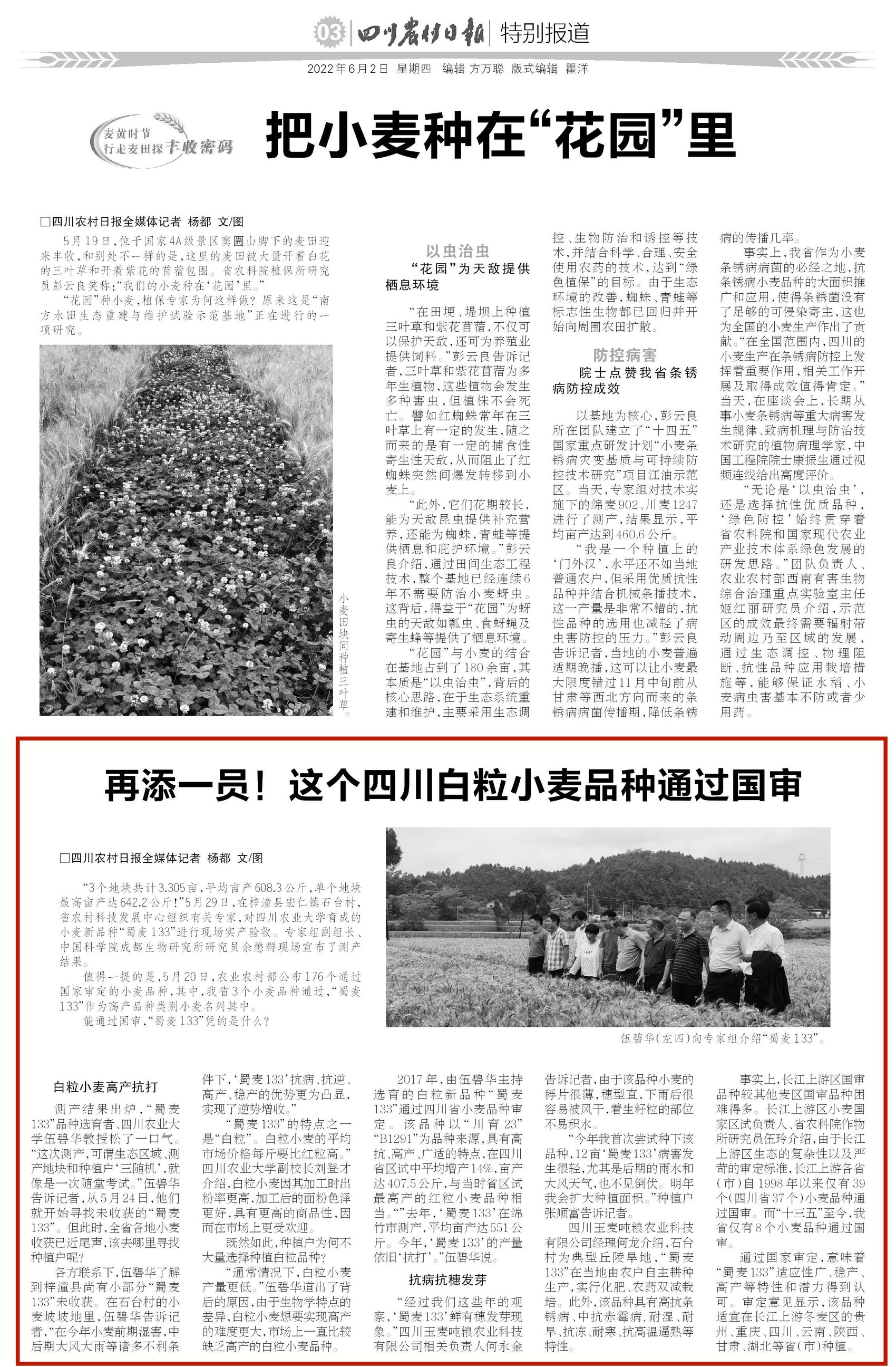 值得一提的是,5月20日,农业农村部公布176个通过国家审定的小麦品种,其中,我省3个小麦品种通过,“蜀麦133”作为高产品种类别小麦名列其中。