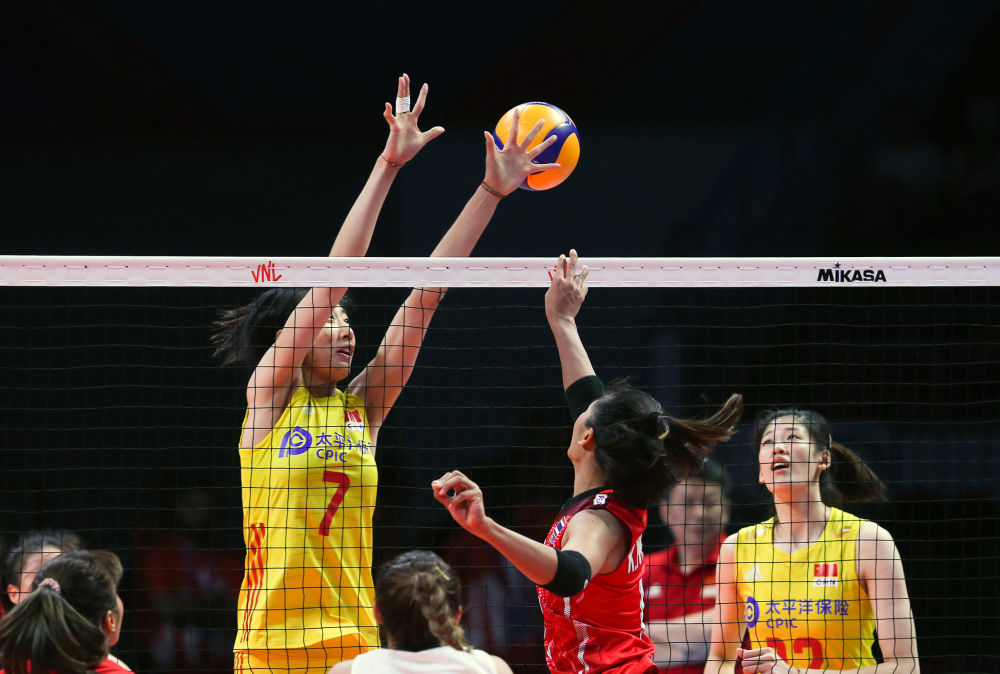↑中国队球员刁琳宇(左)与王媛媛(中)在比赛中拦网。