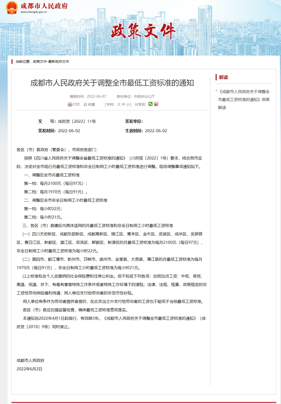 本通知自2022年4月1日起施行,有效期3年。《成都市人民政府关于调整全市最低工资标准的通知》(成府发〔2018〕9号)同时废止。