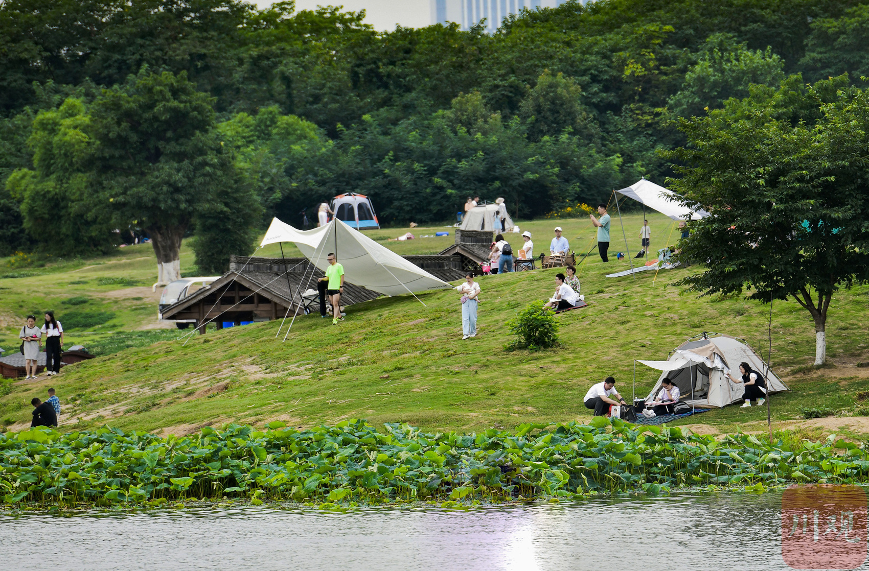 端午假期,市民在青龙湖搭帐篷露营。(川观新闻记者 向宇 摄影)
