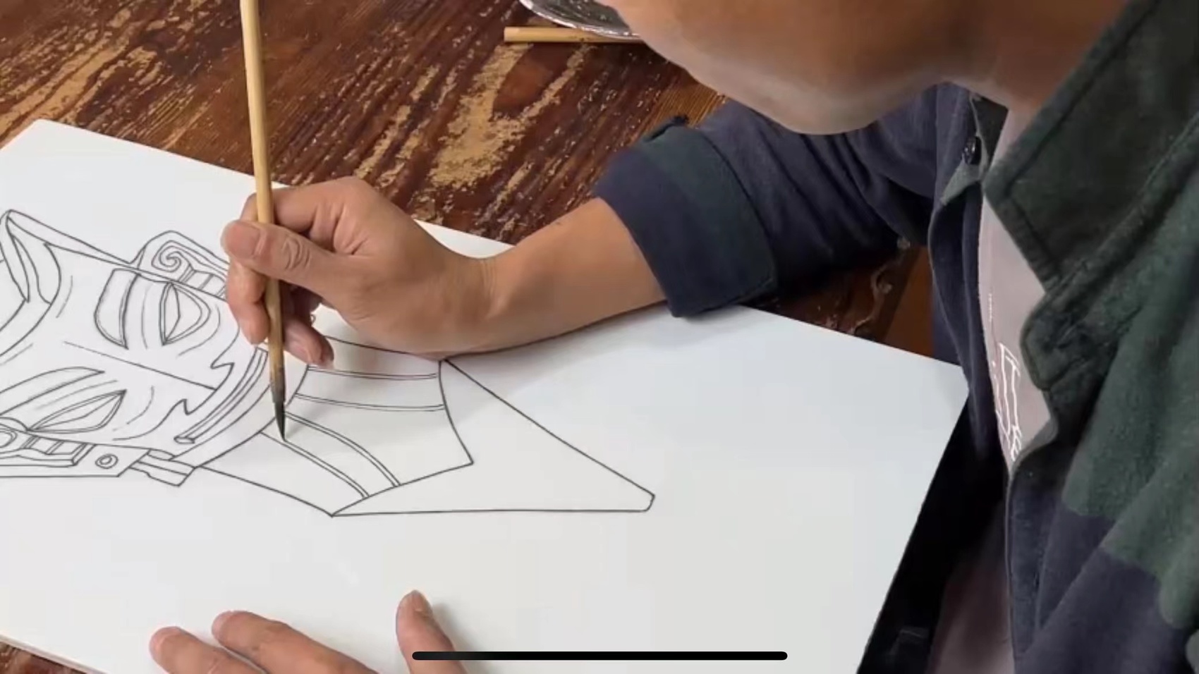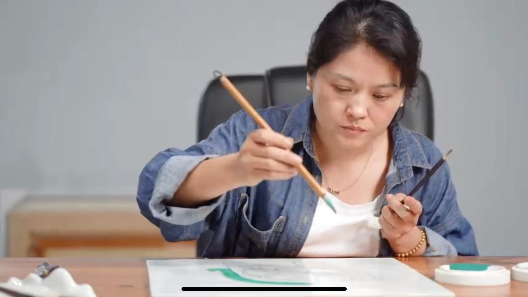 刘志英是全国五一巾帼标兵、首届江西省陶瓷艺术大师,她选择了一件三星堆青铜鸟作为表现对象。以白瓷板作为“画布”,她先用淡墨稿呈现文物形态,以毛笔勾线后用釉彩上色,最后送入窑炉,以800度的高温烧制6小时而成。