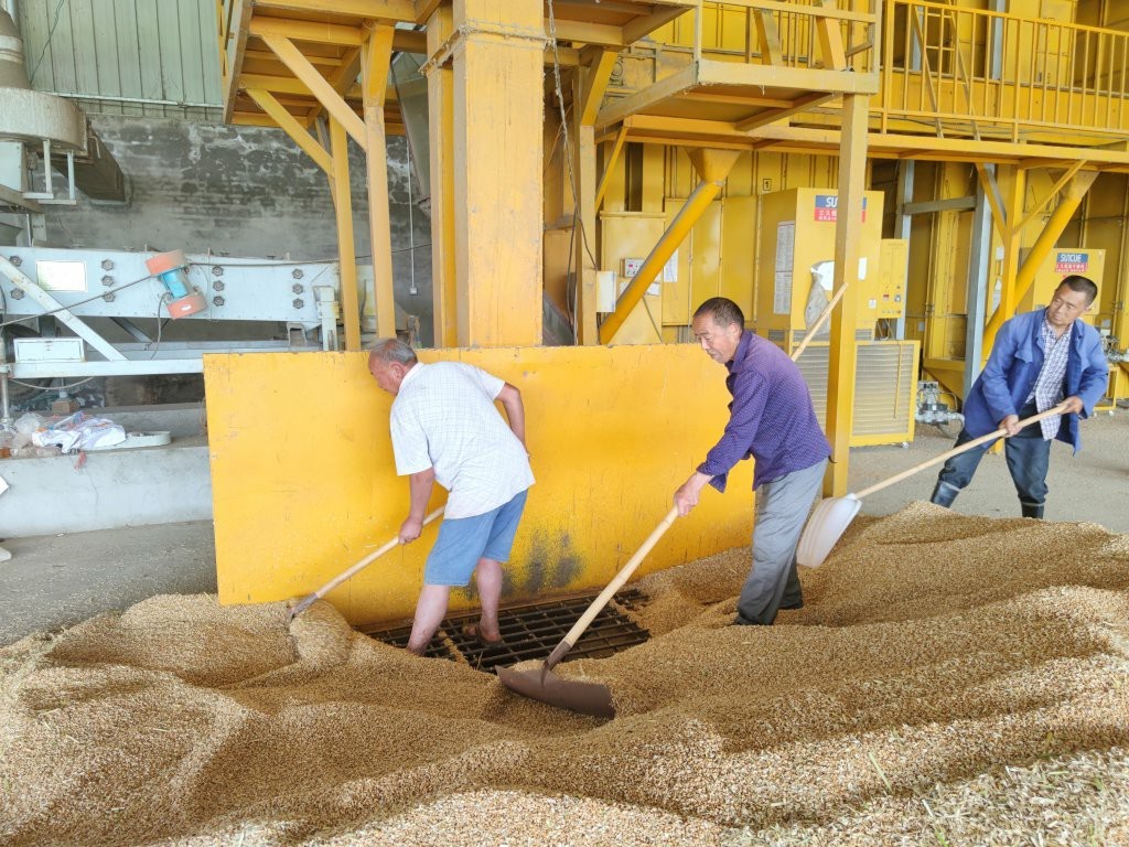 梓潼县卧龙镇桂花村,工人正对收获的小麦进行烘干处理。