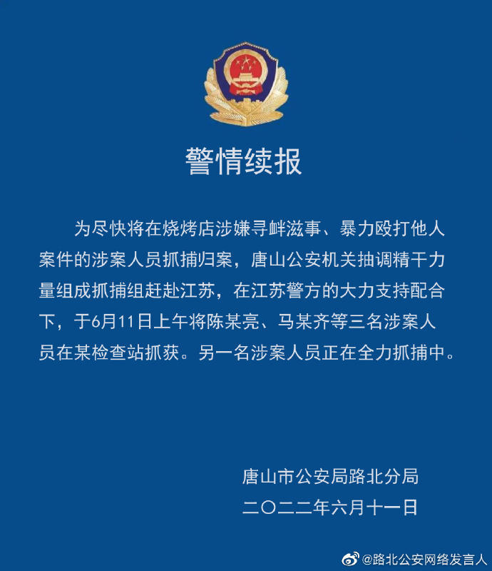 >>此前消息:唐山警方最新通报:已抓获5人!