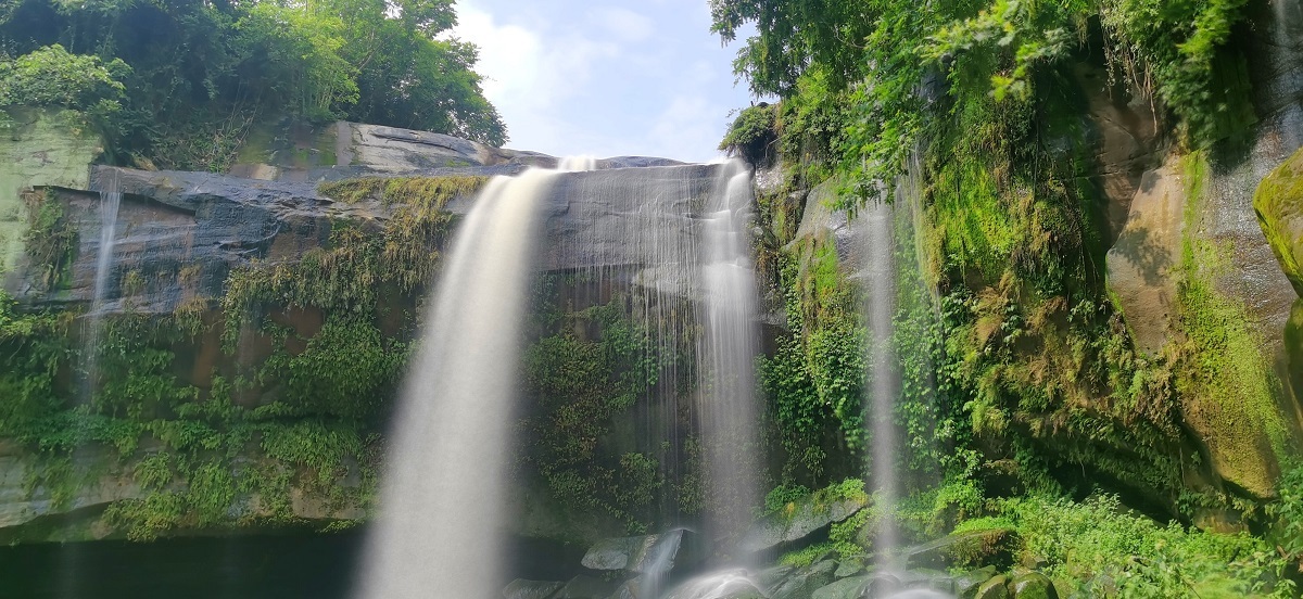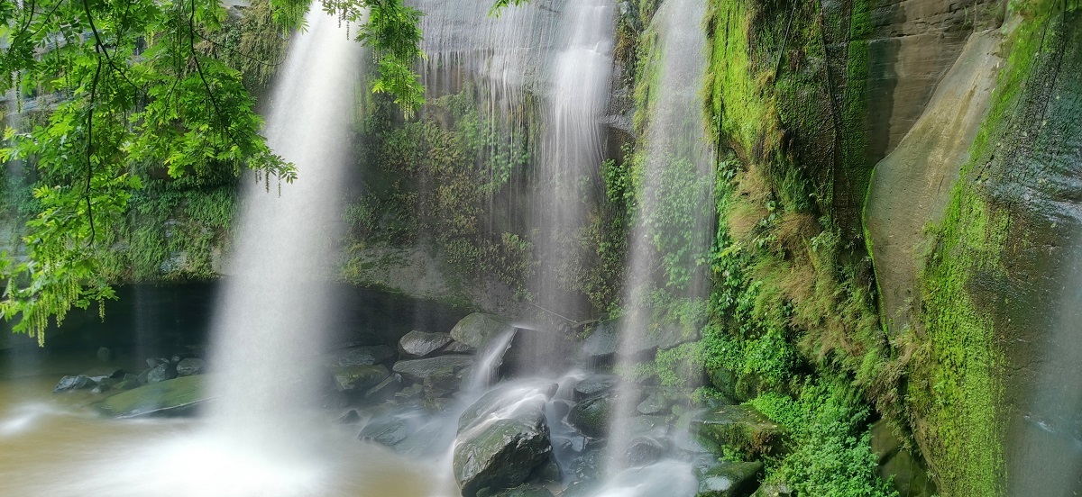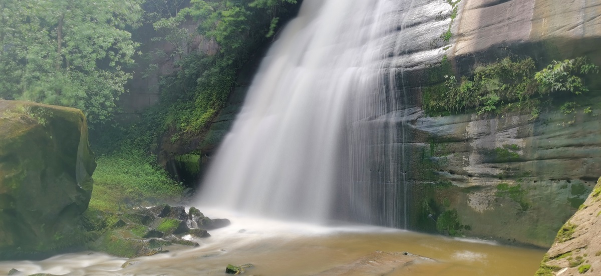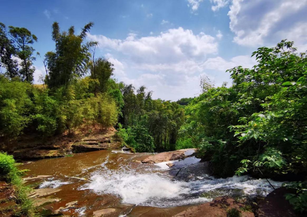 宽阔的瀑布下面的水潭边,树与树、竹林与树木之间交相缠绕。岩壁上的树木依山势挺立,枝逸斜出。绿茸茸的青苔早已爬满了崖壁,形成以苔藓为主要营养的沃土,长出许多树枝和小草。蓝天白云下,太阳光穿过树木和竹叶融合后,洒在瀑布下面宽阔的河床上,构成一副副黑白分明的版画。