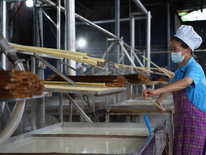 6月12日,隆昌市响石镇宝峰村6组,隆昌市豆香村食品厂内豆香四溢,就近务工的村民们正在忙碌,生产线井井有条,一根根豆杆整齐排列。