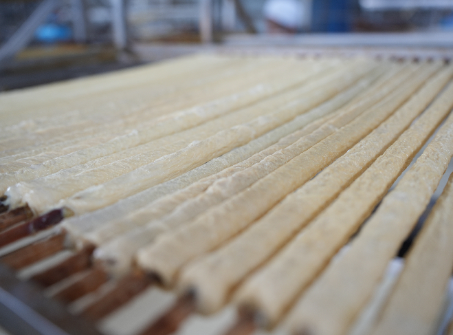 隆昌豆杆的原材料要选择外观饱满、光亮、没有杂质、颜色一致的大豆。大豆经过浸泡、磨浆、煮浆、过滤、起皮、卷制、取签、烘干等多道工序,隆昌豆杆就制作而成。