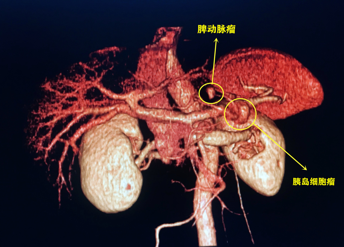 在术前详细阅片制定手术方案时,文君博士及团队又发现了另一个威胁崔爷爷生命的问题——他的胰岛素瘤旁边,竟然同时还“藏”了一个直径近2cm的脾动脉瘤。一旦这个瘤体发生破裂,瞬间就会大出血威胁性命。