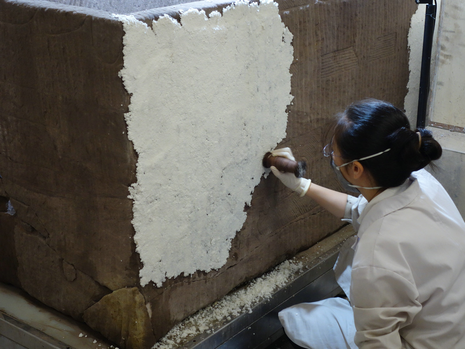 “我们首先从内外两方面分析,寻找病害发生的原因。”刘宇介绍,修复团队首先从石棺取样做岩相分析,结果显示为含钙质粉砂质板岩。石材孔洞明显、结构疏松,内部盐分移动到表面导致泛盐现象,说明风化严重、强度下降。