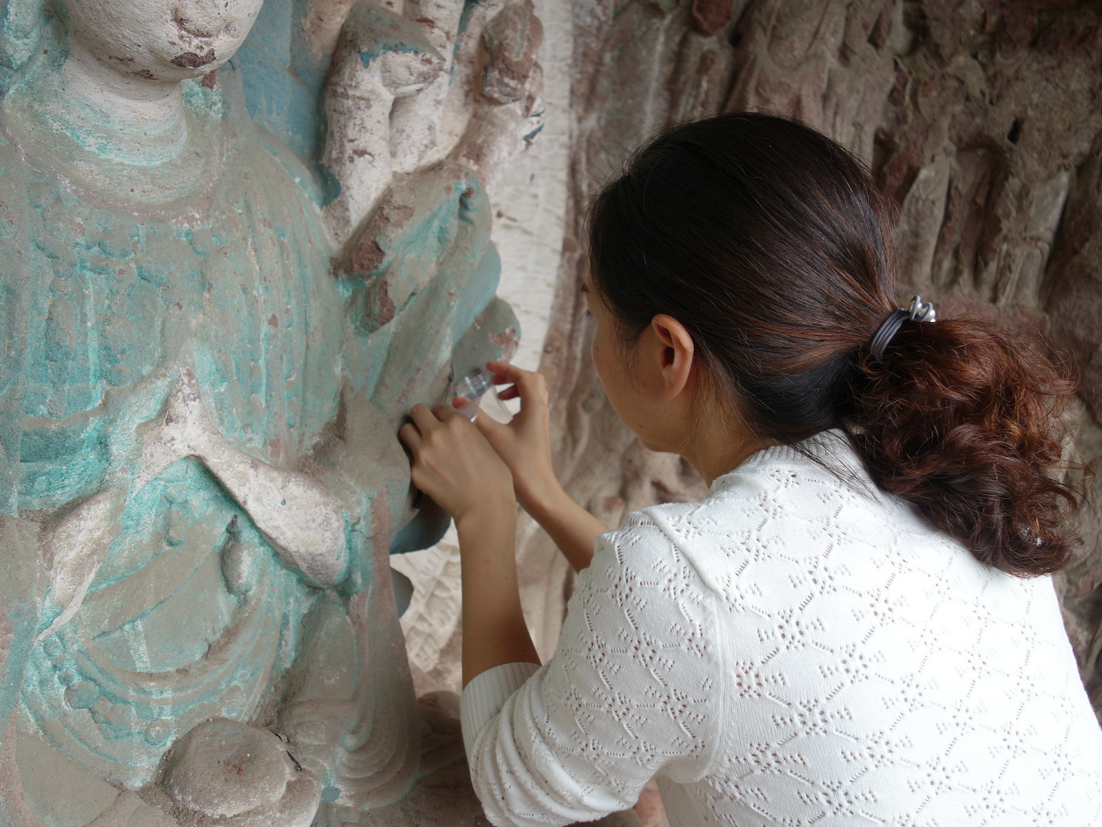 5月底,刘宇前往仪陇,为一处被人为上彩的摩崖石刻造像试验专门配制的清洗试剂。“逐层脱去颜料需要时间,但目前看来有一定效果。”这也是省科技厅项目“四川省石窟寺及石刻表面油饰妆彩清洗成套技术研究”中的一环。