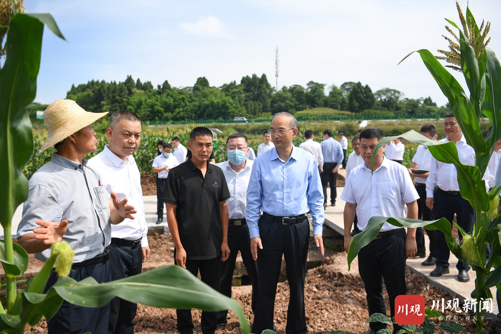 6月14日,省委副书记、省长黄强在安岳县长河源镇长团社区大豆玉米带状复合种植示范点,深入田间仔细察看大豆播种情况,询问种粮大户种植收益情况和面临的困难。