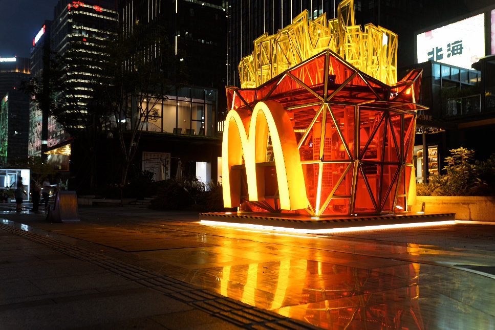 麦当劳创新推出的薯条快闪店,位于成都交子大道的,其设计独特——在以经典红黄双色及薯条外观为设计元素,混搭上工业风钢架结构,再通过几何造型与透明墙面营造出浓浓的电子科技未来感,配合夜晚亮灯的五彩光感,体现出浓浓的“赛博朋克”未来感。在“交子市集”烘托下,与“一环双塔”相互辉映,展开成一幅充满年轻力与烟火气的浪漫画卷,是成都又一新的时尚消费聚集地和新的夜间风景线。