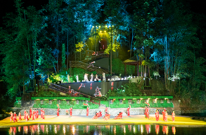 这是大型山水实景演出《遇见威远》首演中《石坪情歌》的一幕。山歌曲调悠扬,充满山野的淳朴与自然,将威远的民间传统艺术及风俗民情传达得淋漓尽致。