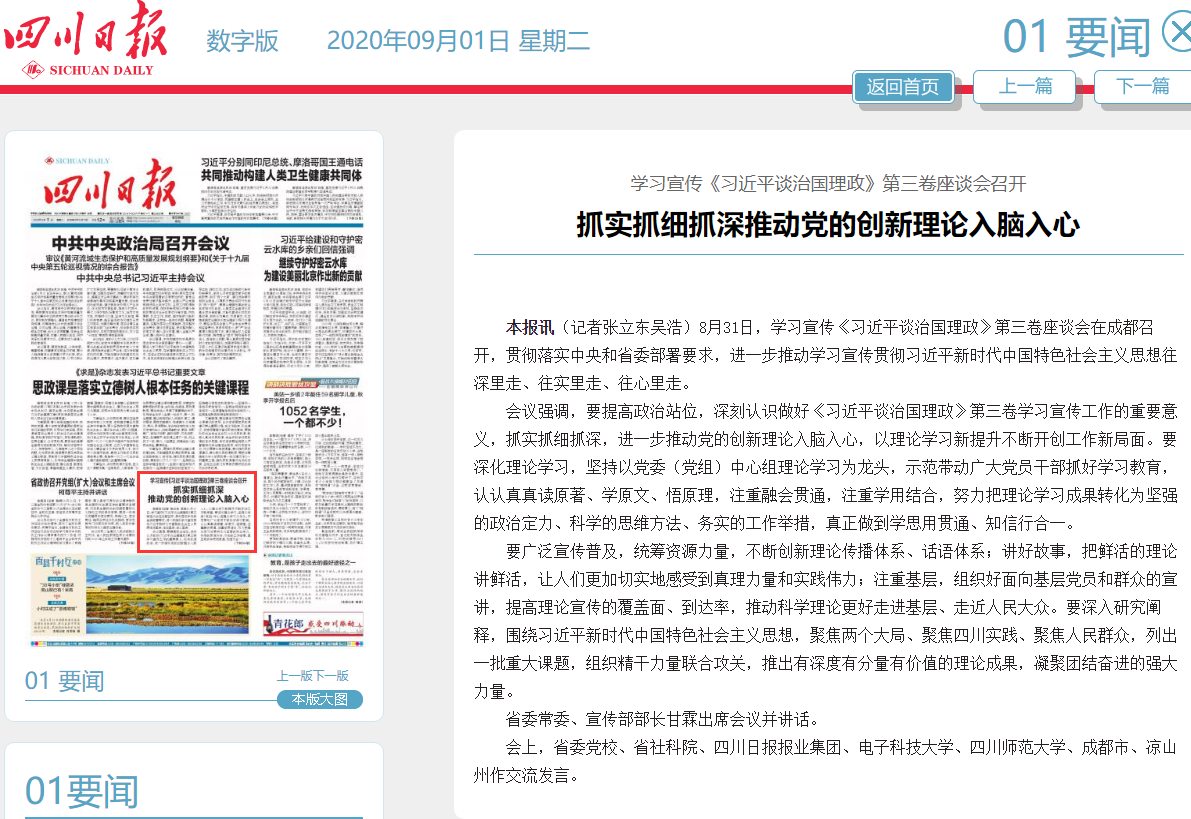 今天,9月1日,四川省委机关报——四川日报在一版上刊登对会议的报道,并以第六版一个整版的篇幅,刊载了省委党校、省社科院、四川日报报业集团、电子科技大学、四川师范大学、成都市、凉山州的交流发言。