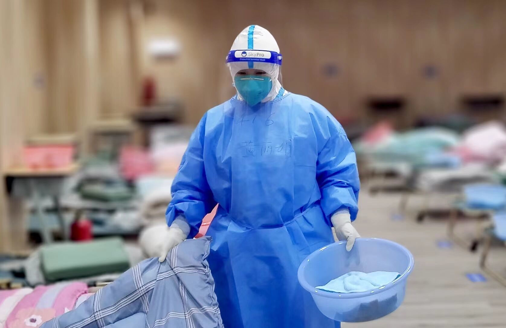 队员承担着为患者打扫房间、清洁被套、信息登记、核酸采样、血糖血压检测等工作。核工业四一六医院供图。