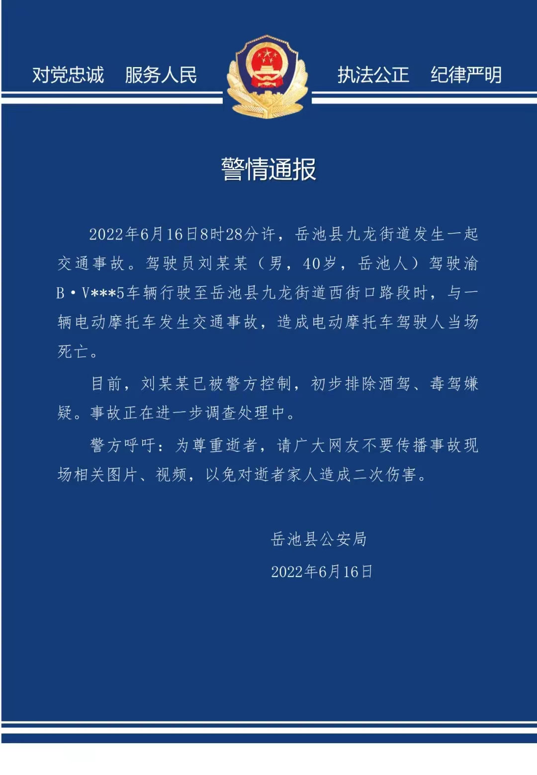 岳池县公安局发布的警情通报显示,驾驶员刘某某(男,40岁,岳池人)驾驶渝B·V***5车辆行驶至岳池县九龙街道西街口路段时,与一辆电动摩托车发生交通事故,造成电动摩托车驾驶人当场死亡。