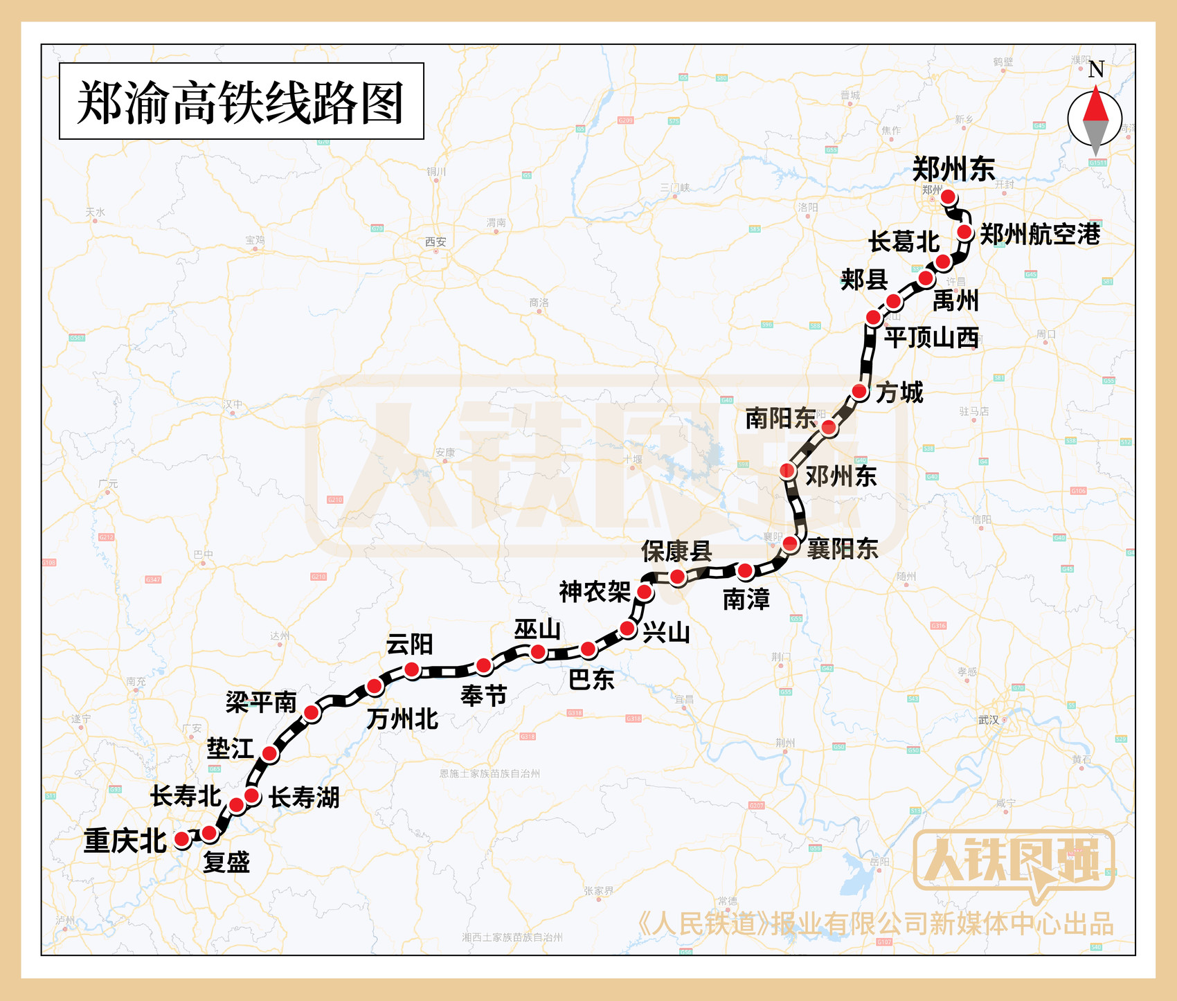 郑渝高铁是我国“八纵八横”高铁网的重要组成部分,线路北起河南省郑州市,南至重庆市,途经河南、湖北、重庆三省市,全长1068公里,串联起嵩山少林寺、襄阳古隆中、神农架原始森林、奉节白帝城、巫山大小三峡等众多著名旅游景点。其中,重庆北至万州北段设计时速250公里,郑州东至襄阳东段、襄阳东至万州北段设计时速350公里。